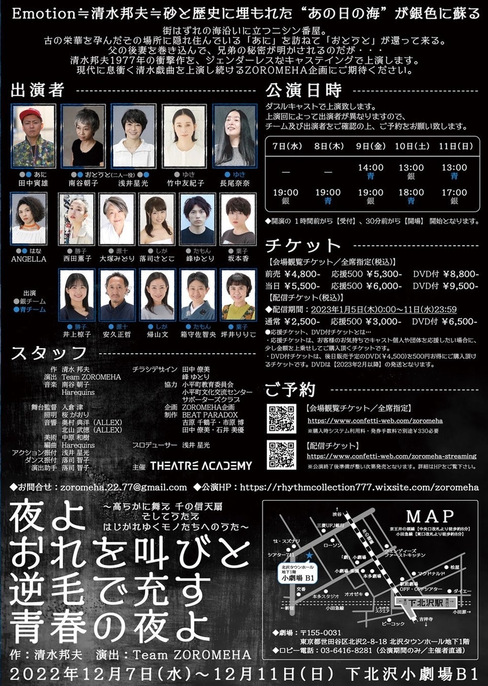 生演奏を加えながら上演することで、2022年のお客様の心に希望や勇気を灯す作品創りを目指し、清水邦夫が拘った「喜劇性」「音楽性」に特化した清水作品を上演し続けるZOROMEHA企画の第4弾となります。格差が広がる現代日本社会の中で、‶はじかれゆく者″‶叫びたくても叫べない者″の行く末に、何かしらの光を感じることのできる舞台にご期待ください。