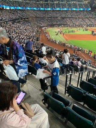 さらに、球団への感謝の意を表す取り組みとして、観客席のごみ拾い活動を実施いたしました。参加者全員で協力して清掃を行うことで、社会的意義を考え・共有する時間となりました。