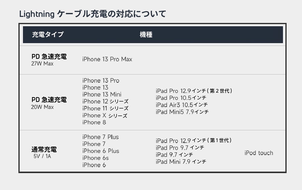 - iPhoneやiPadをLightning-USB typeCケーブルで最大27W急速充電が可能
