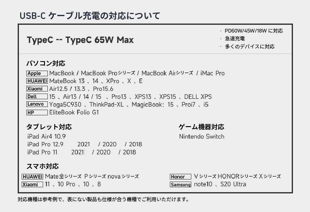 - パソコンやタブレット類をUSB typeC - USB typeCケーブルで最大65W急速充電が可能