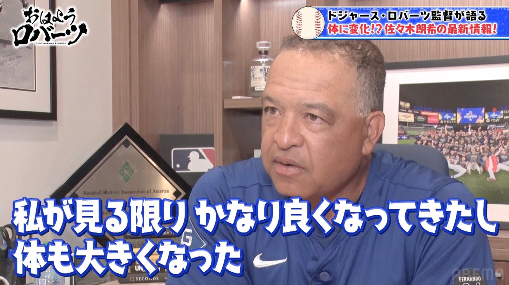 また、佐々木朗希選手の近況について、ロバーツ監督は「トラヴィスコーチが佐々木の練習をよく見ているんだけど、佐々木の体が大きくなってきたと喜んでいた。筋肉量が増えてきたんだ」と話し、「佐々木は早く復帰したい気持ちが強い」「2週間前よりも明るくなってきたし、とてもリラックスしている」と佐々木選手の“変化”を明かしました。「さらに理学療法に肩のためのトレーニングやウエイト、ランニング、スローイング、毎日2時間はトレーニングしている」とも明かし、「私が見る限りかなり良くなってきたし、体も大きくなった」と佐々木選手の様子を語りました。