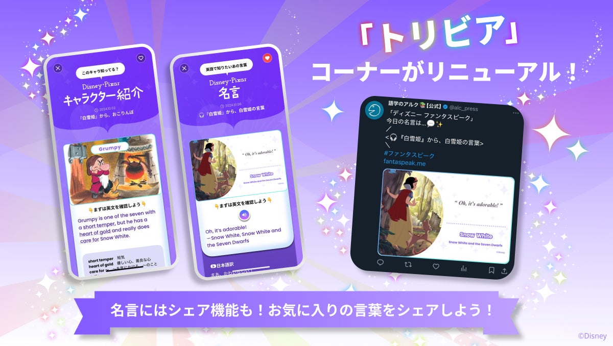 毎日配信している「名言」には、今年の5月に「英語音声」が追加されましたが、このたび新たに「シェア機能」が実装されました。ディズニーやピクサーの作品に登場するキャラクターの名言を音声で学びながら、かわいいイラストと物語の名言をSNSへ投稿することができるようになりました!