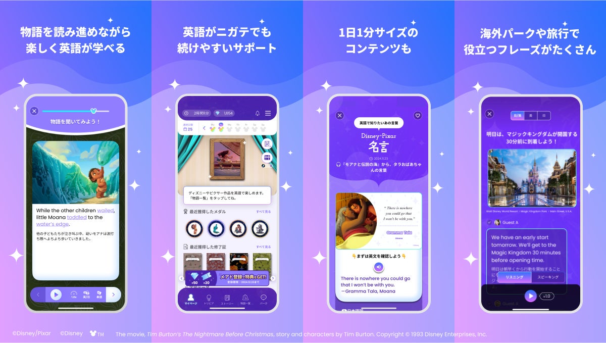 本アプリは、ディズニーやピクサーの作品で英語が学べる、大人向け英語学習アプリです 。ながら学習、スキマ学習に最適な「聞くだけ」から気軽に始められるので、忙しい方や英語初級者の方でも取り組みやすく続けやすいのが特長です。獲得した学習ポイント(ジュエル)を消費することで、基本無料でレッスンを続けられるほか、デイリーボーナスで獲得できるチケットでデジタルアートコレクションを獲得するチャンスがあるなど、楽しみながら英語を学ぶことができます。