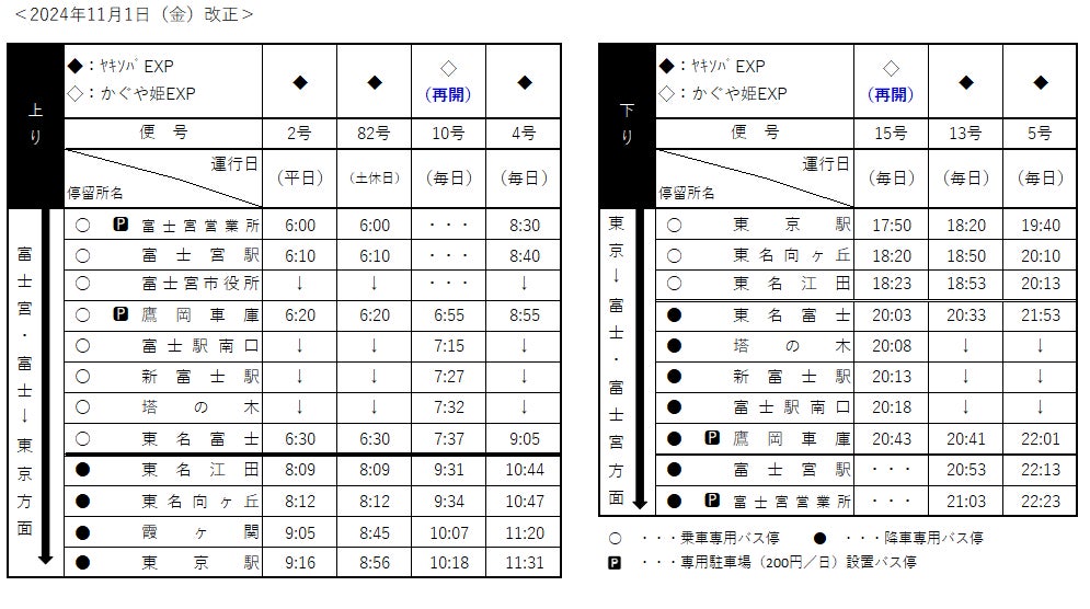 富士急静岡バス株式会社(本社:静岡県富士市厚原、取締役社長:斎藤 俊之)は高速バス「富士宮・富士~東京駅線」において、運休していた「かぐや姫エクスプレス」(富士市エリア~東京駅間)の運行を2024年11月1日(金)より再開いたします。これにより、富士宮・富士エリアと東京駅を結ぶ高速バス路線は、運行中の「ヤキソバエクスプレス」(富士宮エリア発着)の2往復4便と合わせて、全3往復6便での運行となります。