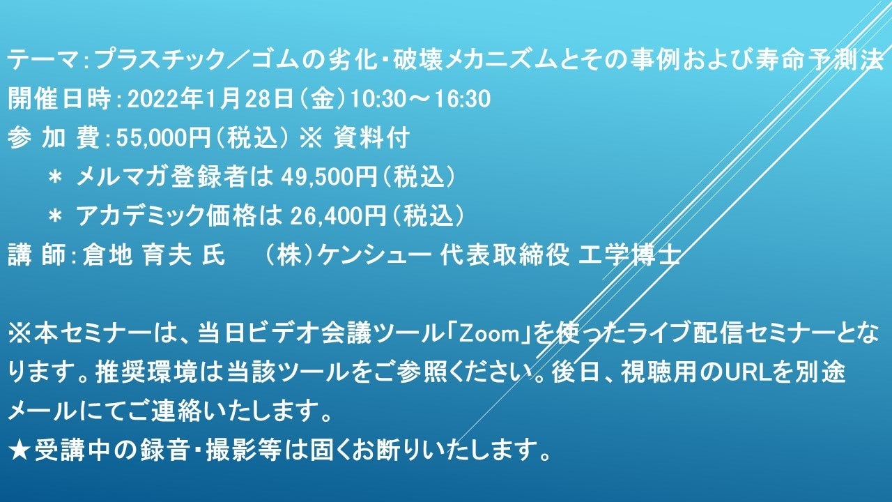 先端技術情報や市場情報を提供している(株)シーエムシー・リサーチ(千代田区神田錦町: https://cmcre.com/ )では、 各種材料・化学品などの市場動向・技術動向のセミナーや書籍発行を行っておりますが、 このたび「プラスチック/ゴムの劣化・破壊メカニズムとその事例および寿命予測法」と題するセミナーを、 講師に倉地 育夫 氏 (株)ケンシュー 代表取締役 工学博士)をお迎えし、2022年1月28日(金)10:30より、 ZOOMを利用したライブ配信で開催いたします。 受講料は、 一般:55,000円(税込)、 弊社メルマガ会員:49,500円(税込)、 アカデミック価格は26,400円(税込)となっております(資料付)。