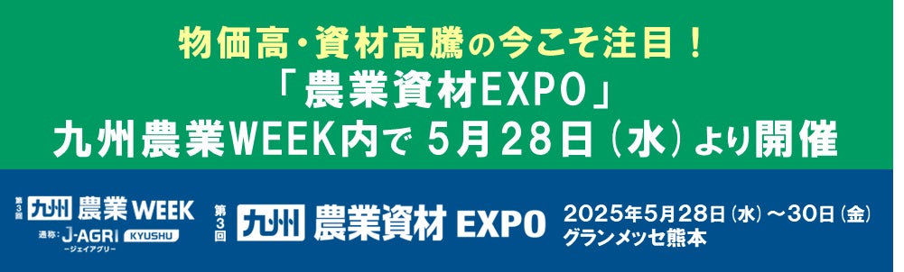 RX Japan株式会社は2025年5月28日(水)〜30日(金)の3日間、グランメッセ熊本にて西日本最大級の農業展示会「九州農業WEEK」を開催します。その中の構成展のひとつが、【農業資材EXPO】です。