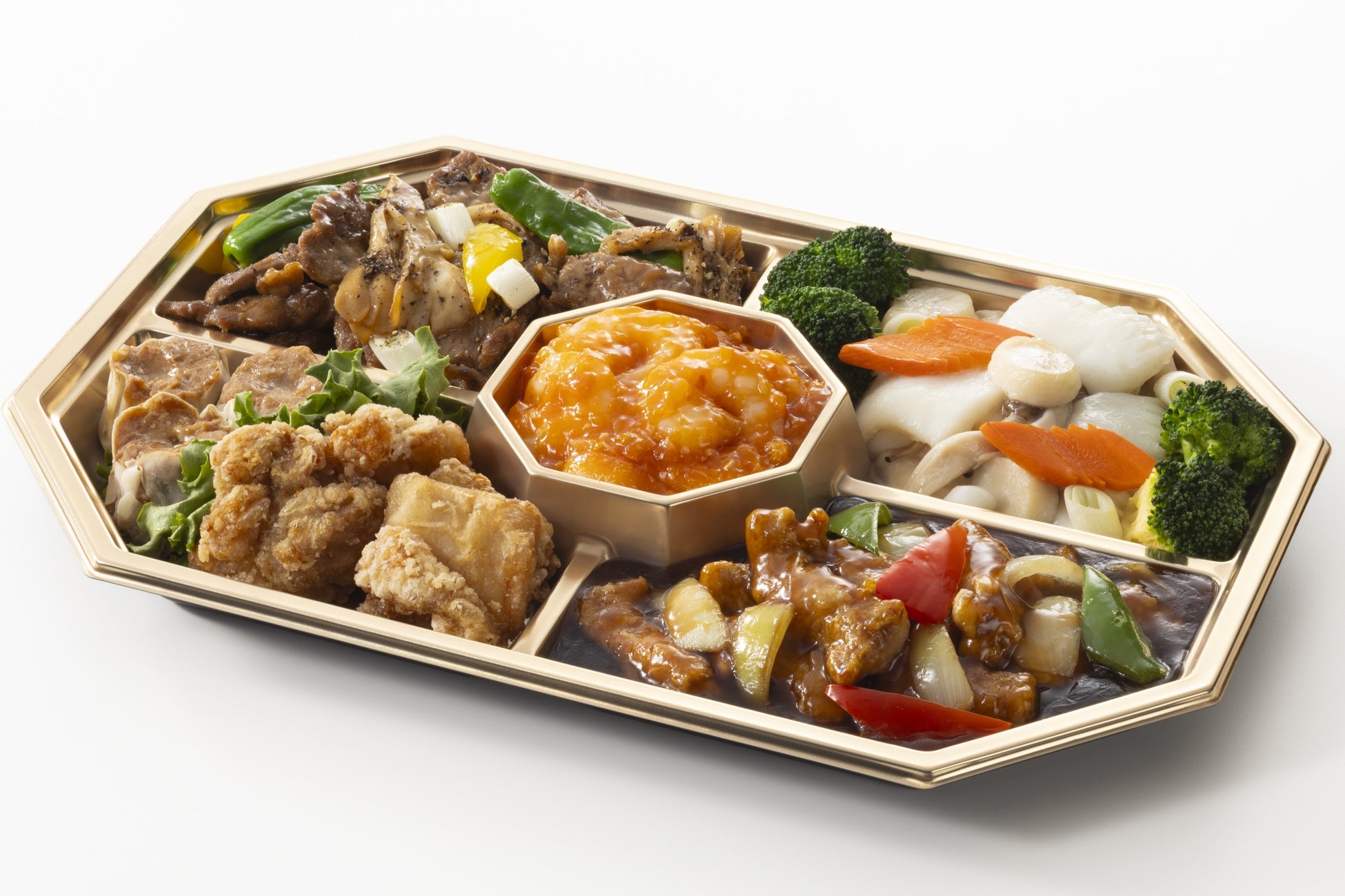 鶏肉の骨なし唐揚げ、豚ヒレ肉の甘酢ソースかけ、烏賊と帆立貝の塩味炒め 他
