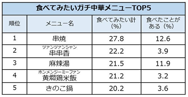 『ホットペッパーグルメ外食総研』がピックアップした「ガチ中華」メニュー12品目のうち、「食べてみたい」という回答が一番多かったのは「串焼」(27.8%)、2位が「串串香」(22.2%)でした。羊肉などを串に刺してこんがり焼き、スパイスのきいた粉をつけて食べる串焼や、火鍋の材料を串に刺して好きなものを食べられる串串香は、焼き鳥好きの日本人にはとっつきやすいのかもしれません。すでにブームになりつつある「麻辣湯」(21.5%)は3位、鶏肉や野菜を土鍋で煮込む「黄燜鶏米飯」(21.2%)は4位、大量のキノコで出汁をとる「きのこ鍋」(20.2%)は5位でした。