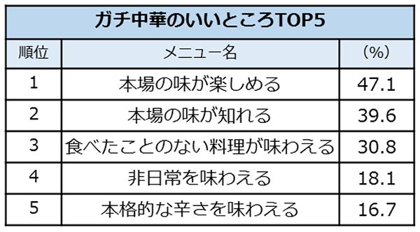 ここ数年、都内でも各地でオープンしている人気急上昇中のガチ中華。もともと人気の高い中華料理のなかでも、「行ってみたい」という回答が4割弱という結果でした。その理由としては「本場の味が楽しめる/知ることができる」「食べたことのない料理が味わえる」など、未知の味への好奇心が上位に挙がりました。食べてみたいメニューの上位にも「串焼」や「串串香(ツァンツァンシャン)」など、まだ食べたことのある人の少ない料理が並びます。今後もガチ中華が市民権を得ていくことで、中華料理の“三国時代”が訪れるかもしれません。