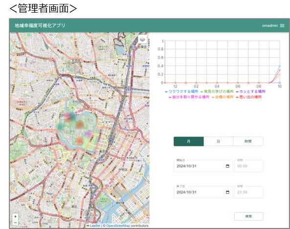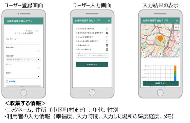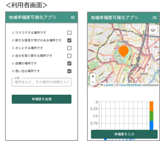 住民が感じた幸福度をスマートフォンを通じてリアルタイムで記録でき、まちづくりに役立つデータを即時で収集可能