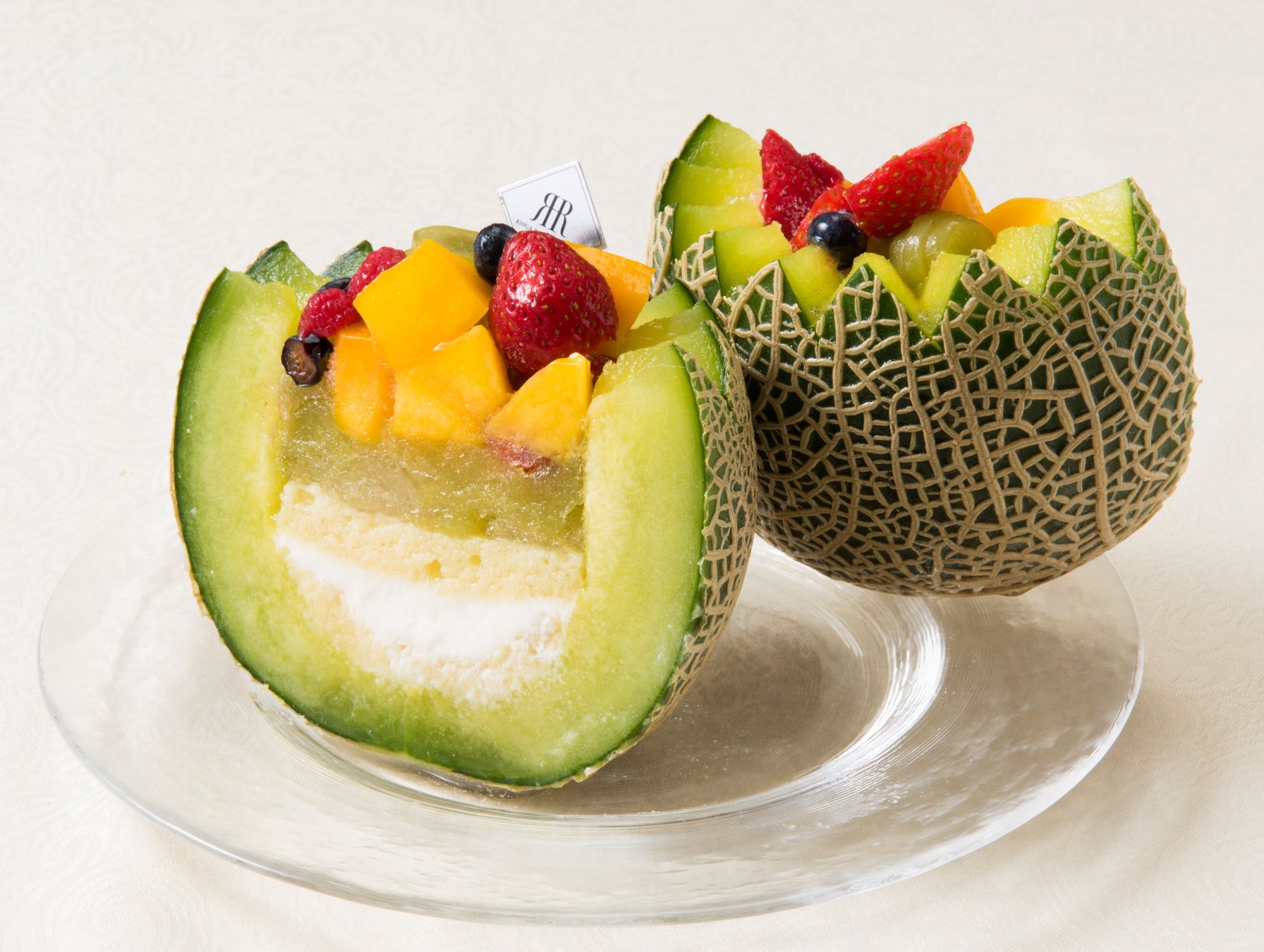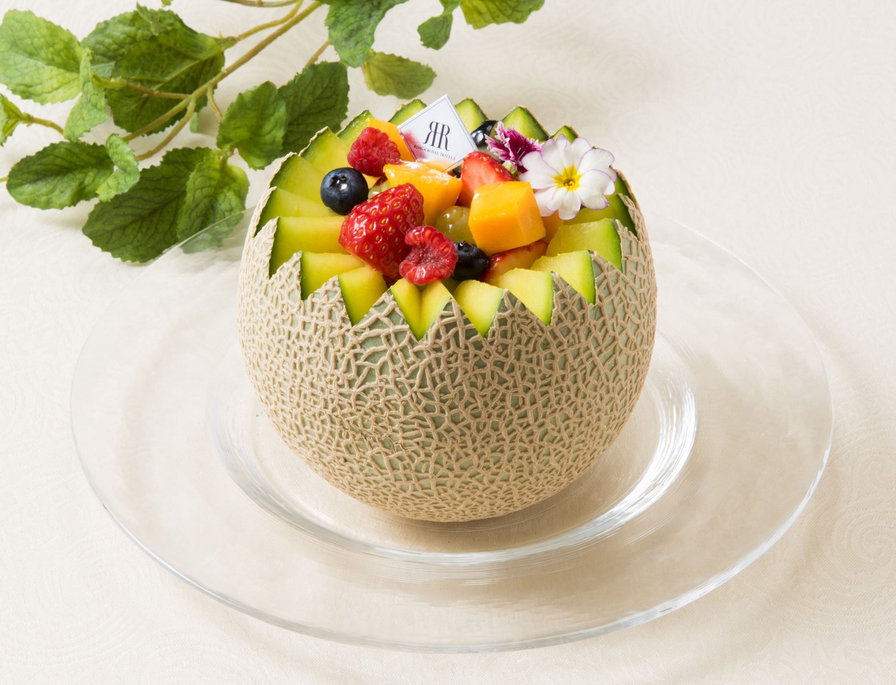 「丸ごとマスクメロンケーキ」は、マスクメロンの中身をくり抜いて器にし、生クリームとスポンジ、メロンのジュレが層になったケーキです。メロンやマンゴー、苺などのフルーツとエディブルフラワーをトッピングし華やかに仕上げており、贈り物にもぴったりのひと品です。