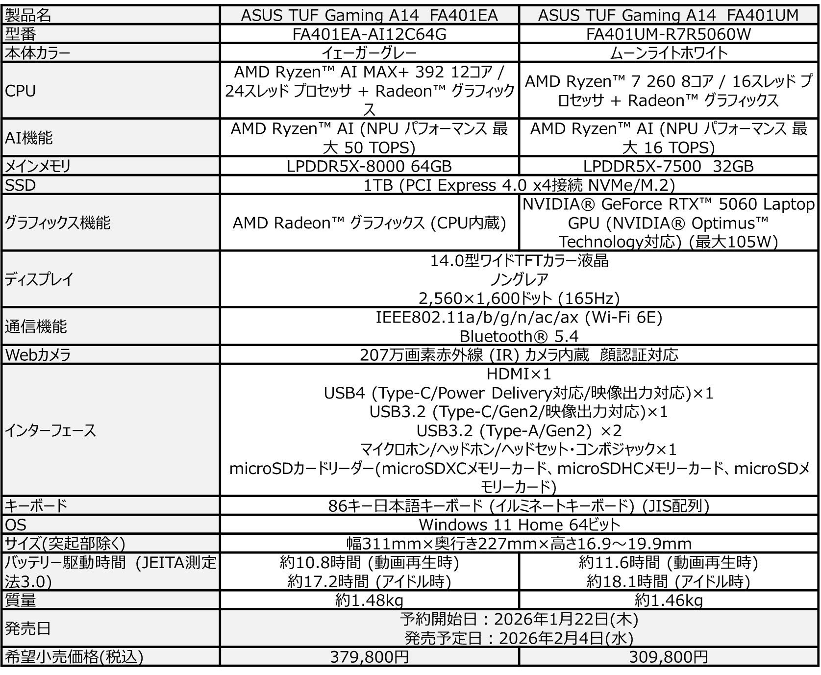 ※今回発表のASUS TUF Gaming A14 FA401EAの詳細スペックはこちらからご確認ください。