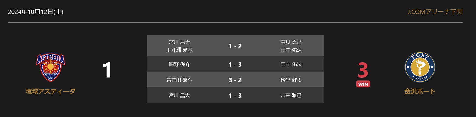 ノジマTリーグ 2024-2025シーズン 公式戦 10月12日開催 琉球アスティーダ vs 金沢ポート の試合は、3-1で金沢ポートが勝利しました。