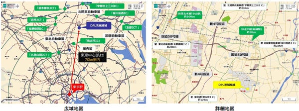 今回開発する「DPL茨城結城」は、結城第一工業団地内に位置することに加え、新4号国道(新4号バイパス)や国道50号の幹線道路に近接し、首都圏中央連絡自動車道(圏央道)や東北自動車道、北関東自動車道のインターチェンジまで約20kmと、首都圏をはじめ東北エリアへの配送拠点としても交通利便性が高い場所に位置しています。