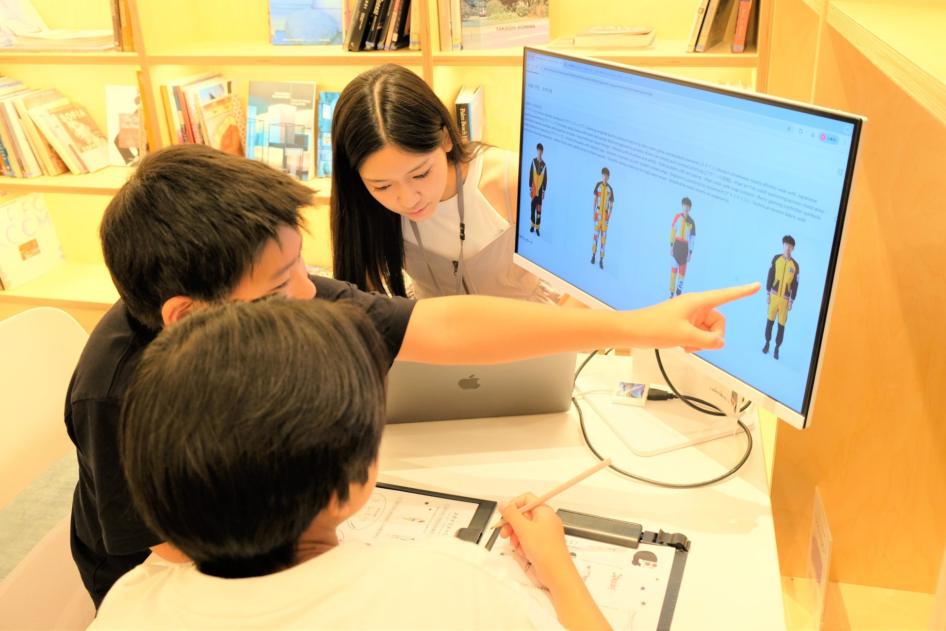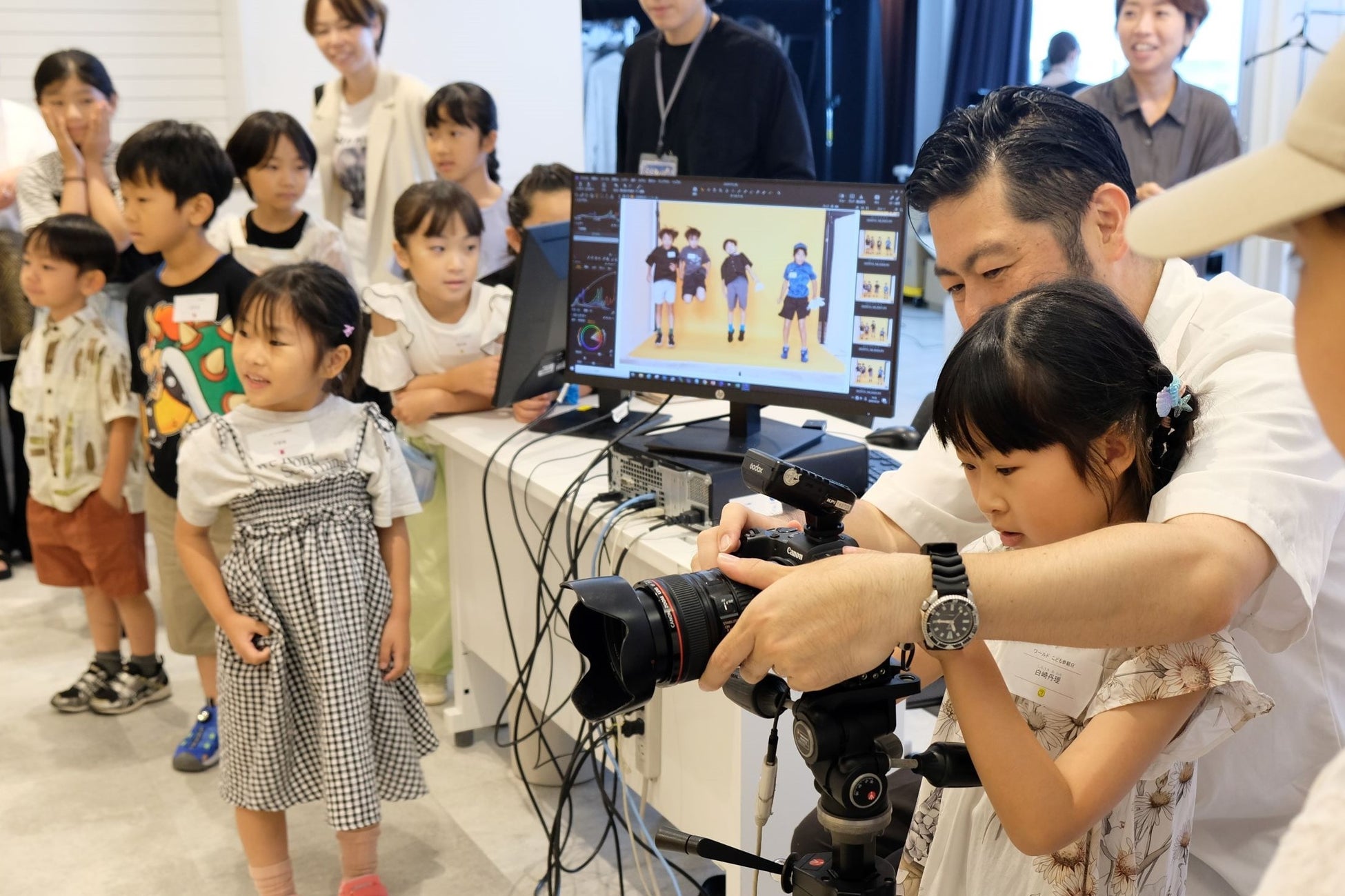 撮影スタジオではオンラインストアの業務を学びつつ、こどもたち自身もモデルとなり撮影を体験。ワークショップでは、アパレルの製造過程で発生した残布と不織布を活用した「サンクスフラワーづくり」。そして今回の新たなプログラム「生成AIにチャレンジ」では、自分の好きな色やキャラクター、テイストなどのプロンプトを作成し、自らデザインした洋服をモデルに着用させてスタイリングを完成させました。