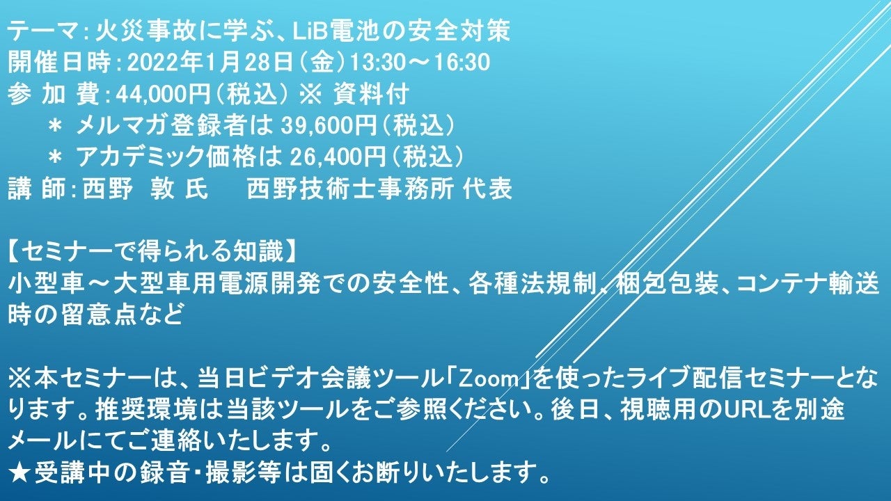 先端技術情報や市場情報を提供している(株)シーエムシー・リサーチ(千代田区神田錦町: https://cmcre.com/ )では、 各種材料・化学品などの市場動向・技術動向のセミナーや書籍発行を行っておりますが、 このたび「火災事故に学ぶ、LiB電池の安全対策」と題するセミナーを、 講師に西野 敦 氏 西野技術士事務所 代表)をお迎えし、2022年1月28日(金)13:30より、 ZOOMを利用したライブ配信で開催いたします。 受講料は、 一般:44,000円(税込)、 弊社メルマガ会員:39,600円(税込)、 アカデミック価格は26,400円(税込)となっております(資料付)。