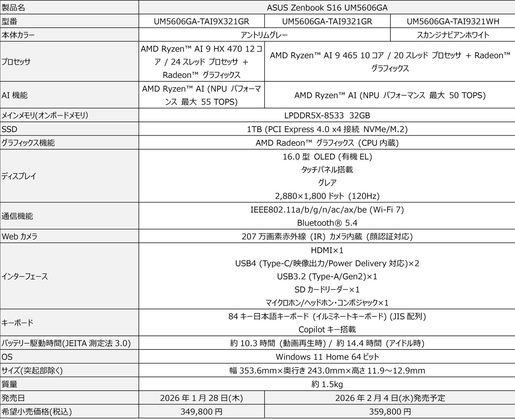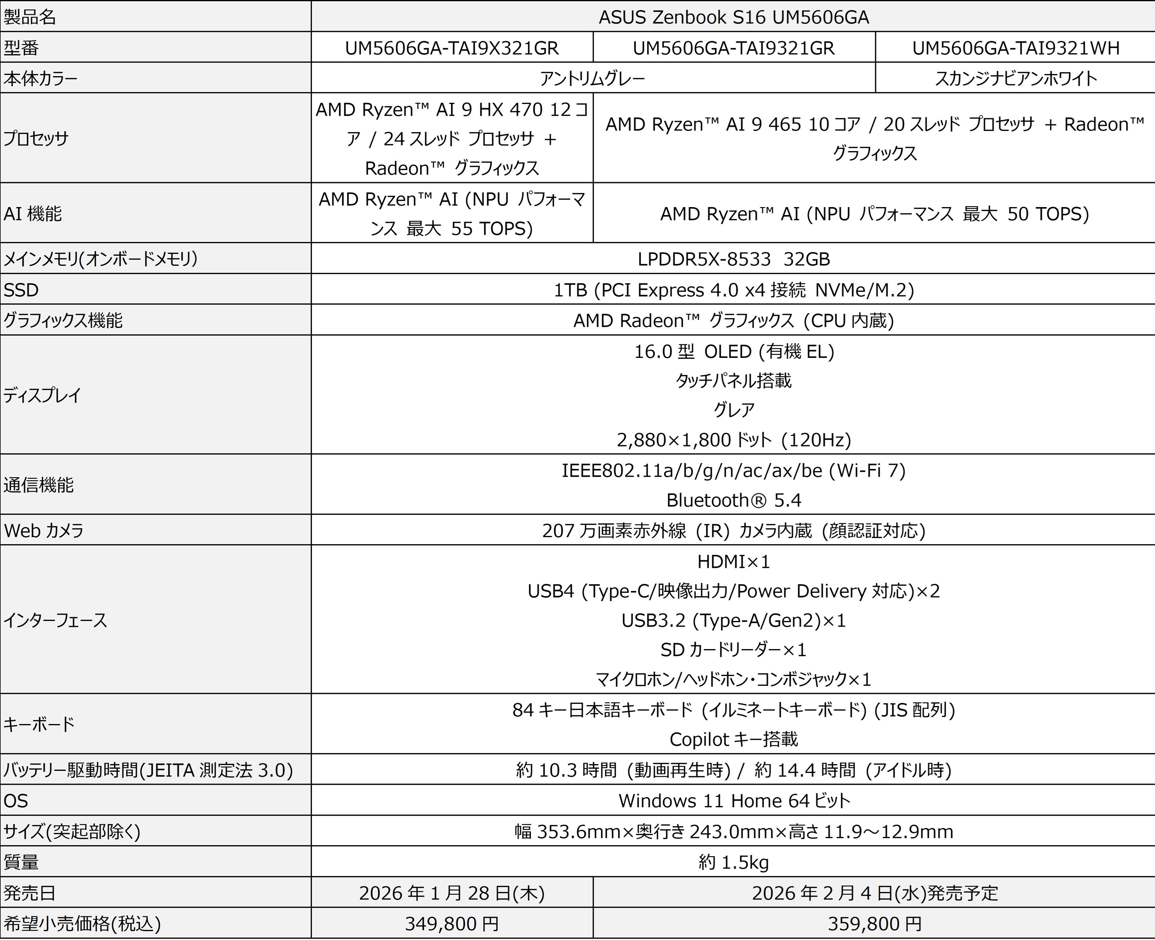 ※今回発表のASUS Zenbook S16 UM5606GAの詳細スペックはこちらからご確認ください。