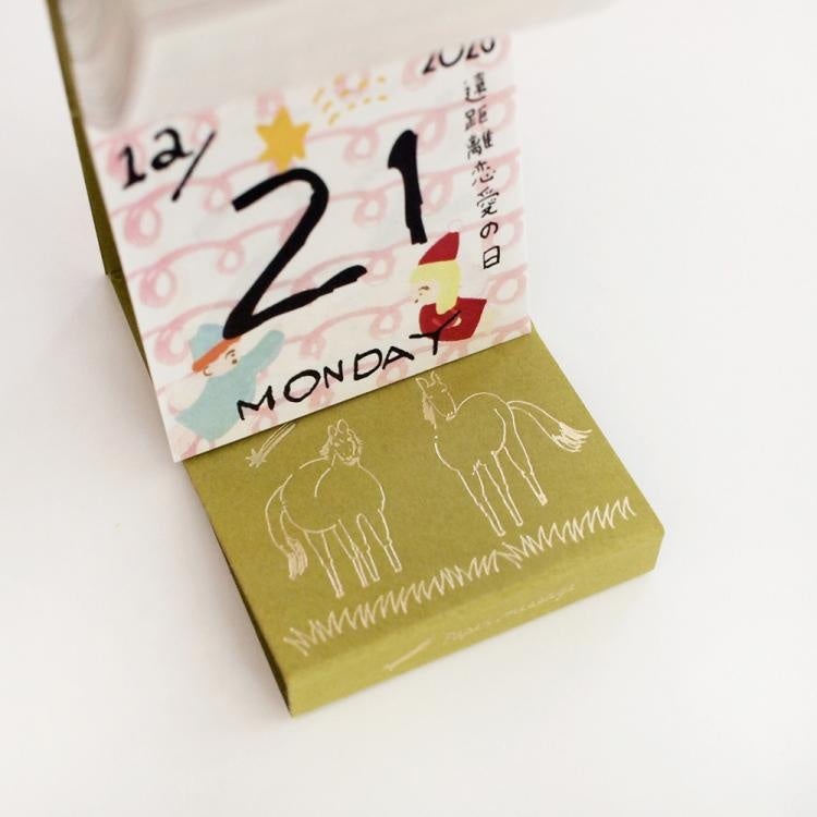手書きの文字と8名のデザイナーによる絵柄を楽しむことができる、人気の日めくりカレンダー。台紙のカラーと箔押しのイラストはロフト限定デザインです。