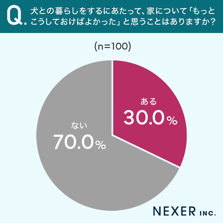 3割の方が犬との暮らしをするにあたって、家について「もっとこうしておけばよかった」と思うことが「ある」と回答しています。