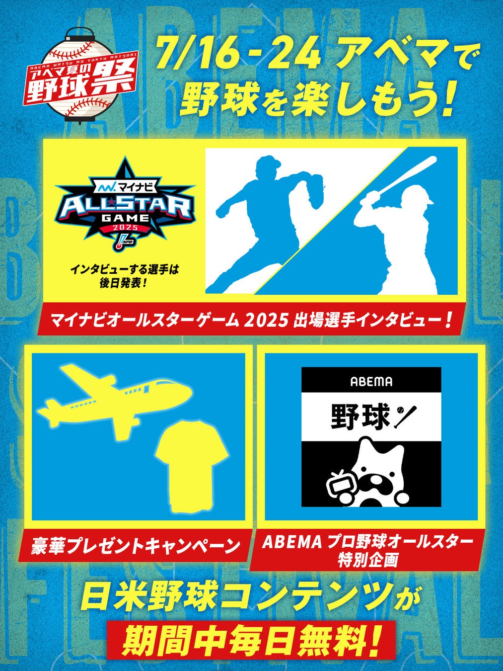 新しい未来のテレビ「ABEMA(アベマ)」は、2025年7月16日(水)から24日(木)までの期間を『アベマ夏の野球祭』と題して、MLB(メジャーリーグベースボール)公式戦や日本プロ野球の年に一度の祭典、『マイナビオールスターゲーム2025』を生中継するとともに、これらに関連するSNSでの企画動画など、日米の野球コンテンツを期間中、毎日無料でお届けする野球づくしの9日間をお届けいたします。