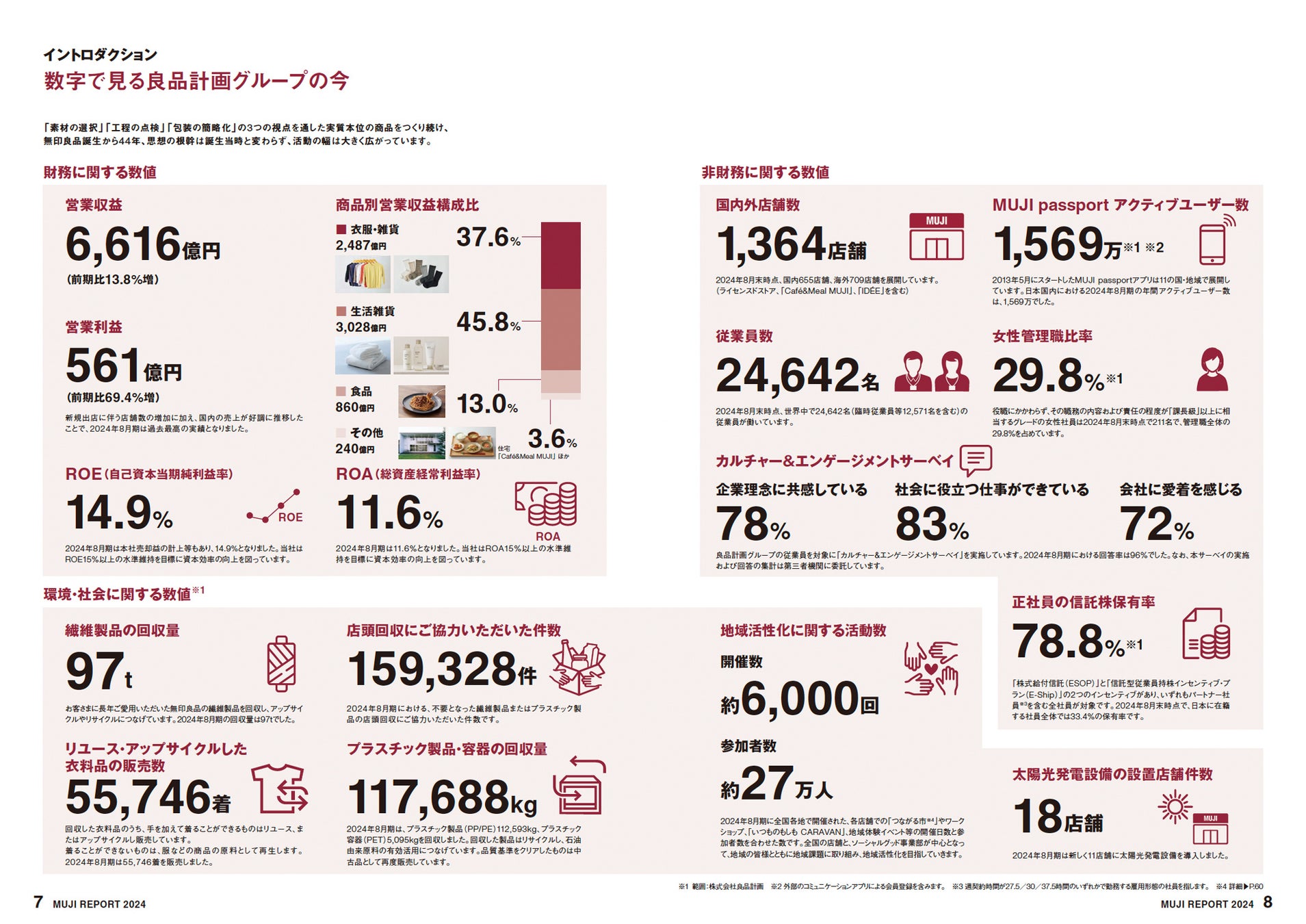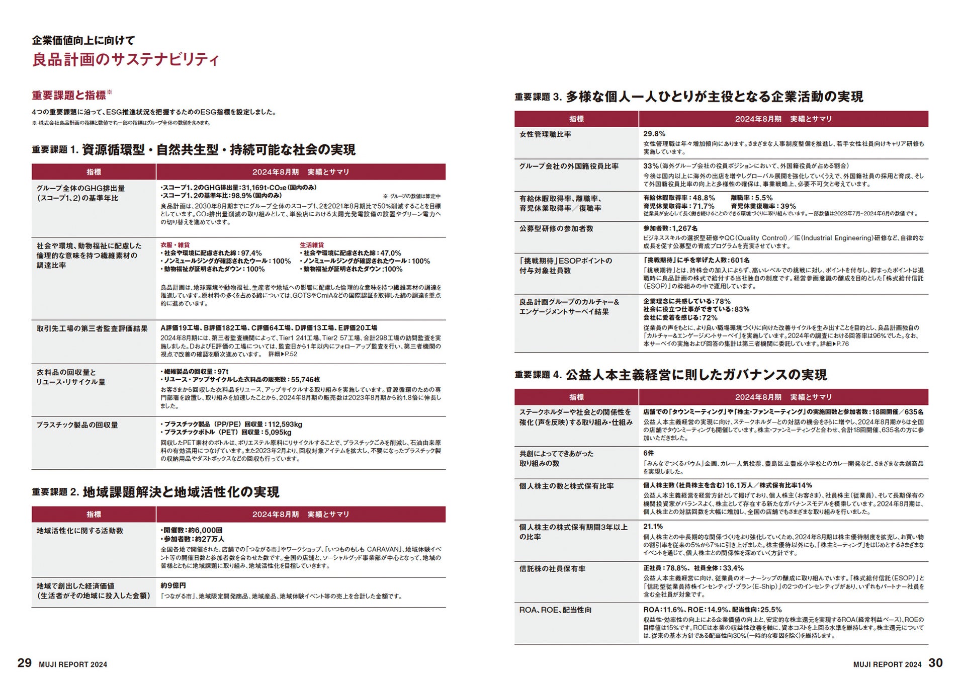 本レポートでは、ESG経営のトップランナーを目指す良品計画が掲げた4つの重要課題を軸として、企業価値向上に向けた各事業活動の基本方針、当該年度の重点取り組みと実績についてご紹介しています。