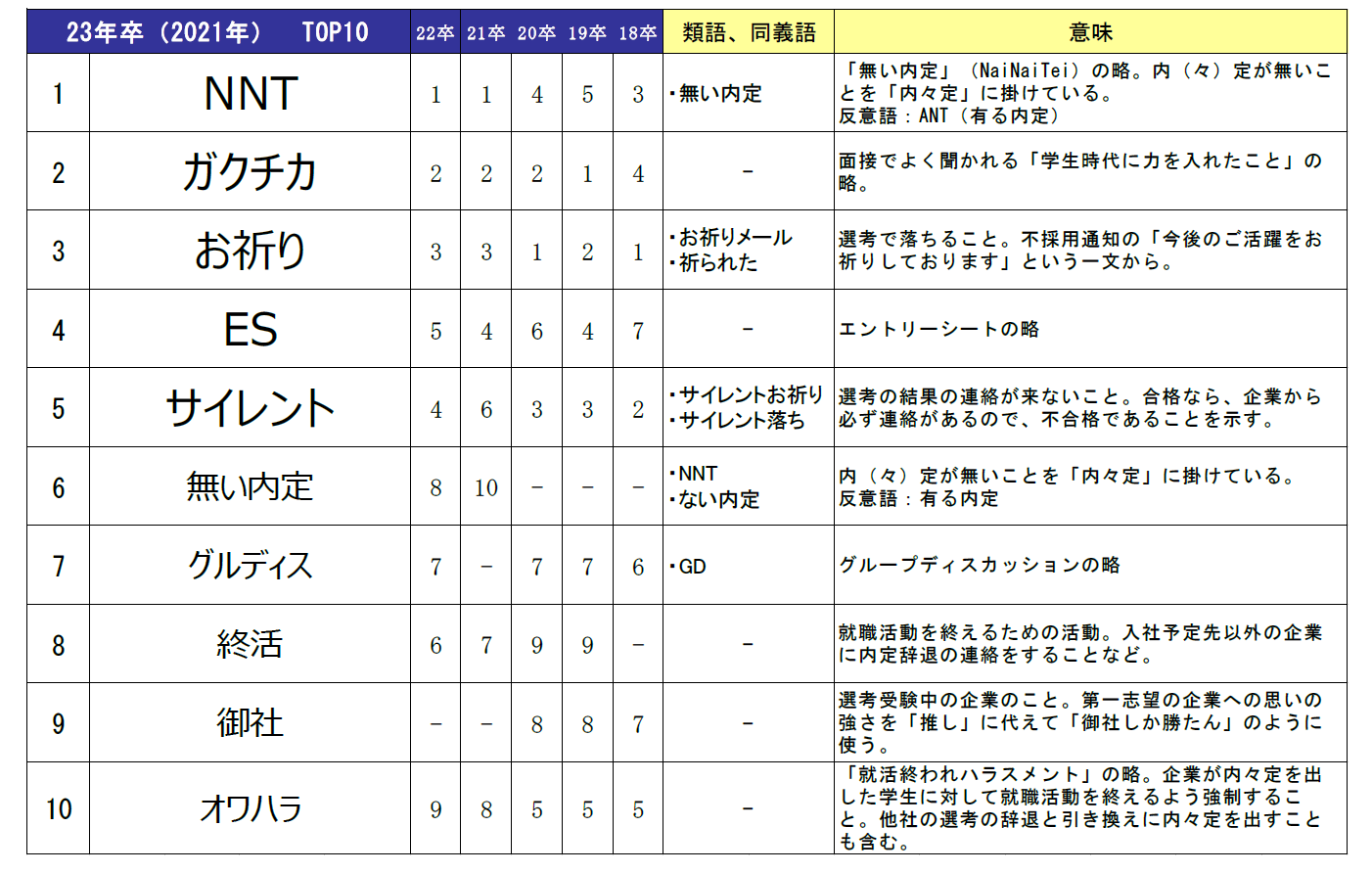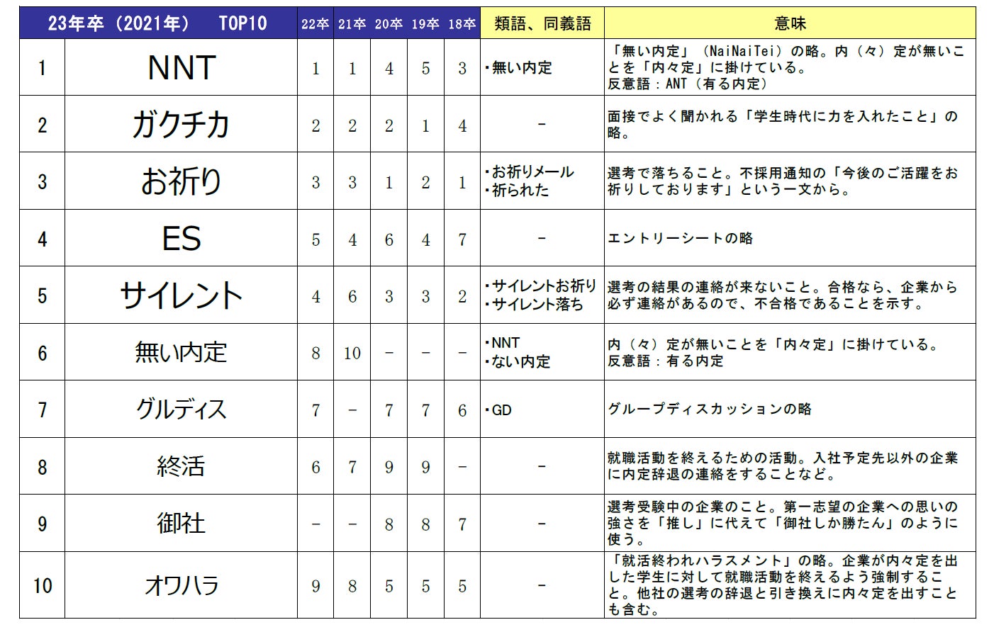 - 周りで流行った就活用語は3年連続で「NNT」(無い内定の略語)が1位に【図3、4】