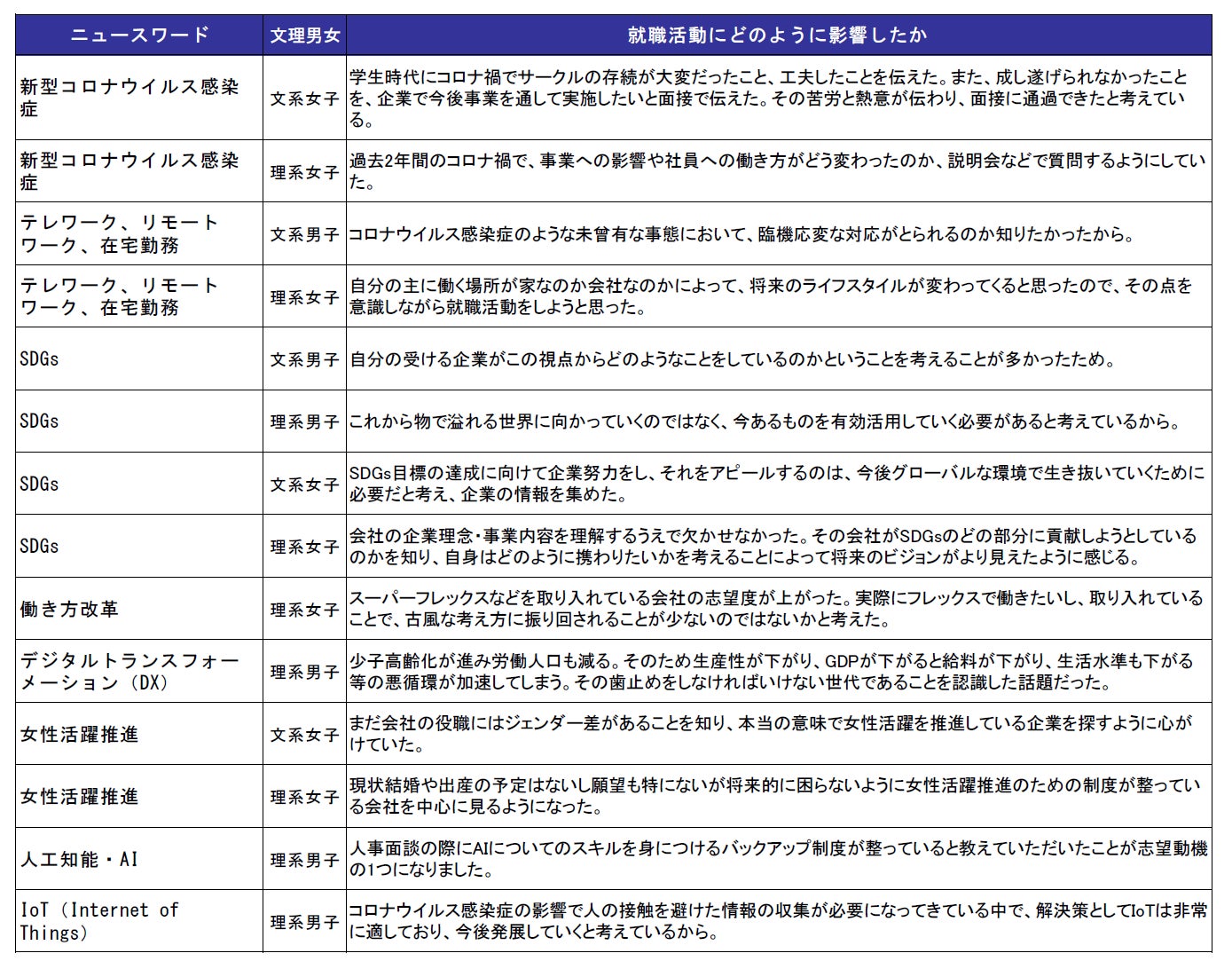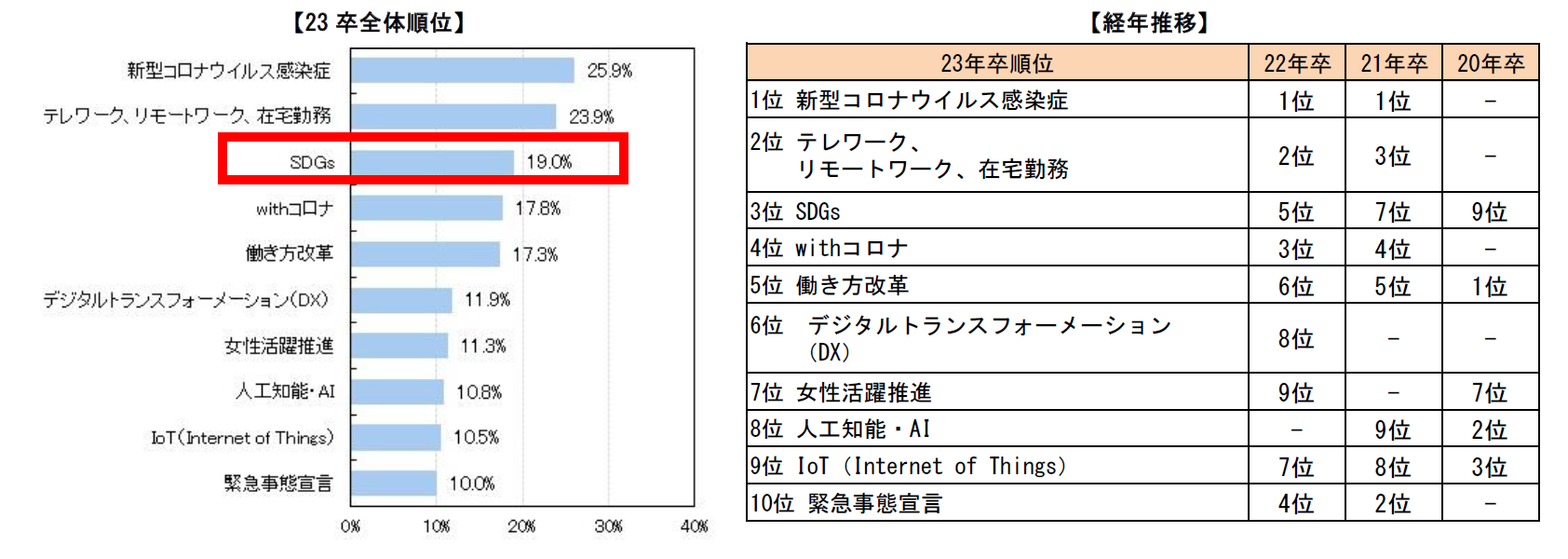 - 就職活動に影響したニュースワードは1位「新型コロナ」、2位「テレワーク」、3位「SDGs」。「SDGs」は3年前(9位)から年々順位を上げ初のベスト3【図1、2】