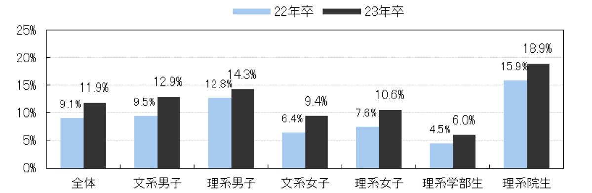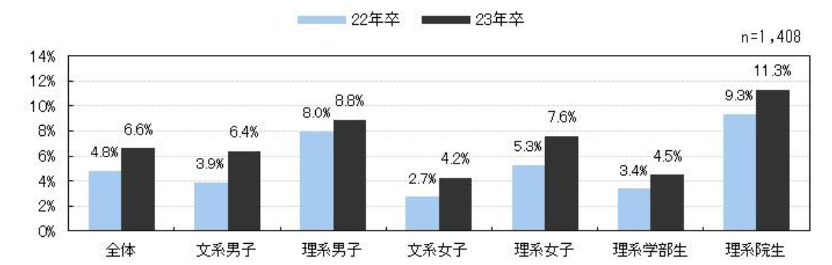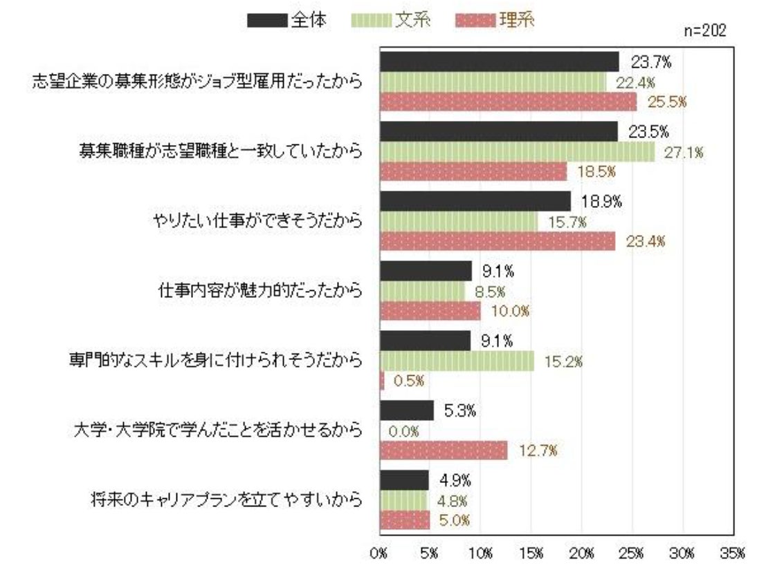 ジョブ型雇用の採用選考に応募したことがある学生は前年比2.8pt増の11.9%だった。また、入社予定先を決めている学生のうち、ジョブ型雇用で採用された割合は前年比1.8pt増の6.6%で前年よりわずかに増えた。特に理系院生の割合は前年比2.0pt増の11.3%で、大学院で学んだ専攻を活かしたい大学院生とスペシャリストを採用したい企業のニーズが一致して、ジョブ型雇用が進んでいる様子がうかがえる。ジョブ型雇用の採用選考に応募した理由では「志望企業の募集形態がジョブ型雇用だったから(23.7%)」の割合が最も高かったが、僅差で「募集職種が志望職種と一致していたから(23.5%)」が続いた。また学部別に見ると、「専門的なスキルを身に付けられそうだから」を選択したのはほとんどが文系学生で、「大学・大学院で学んだことが活かせるから」を選択したのは全員理系学生だった。【図5、6、7】
