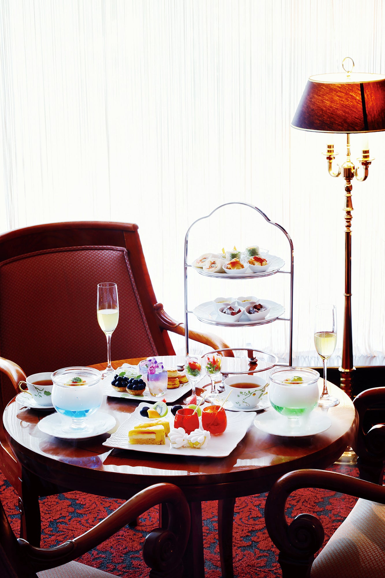 今回は、夏にゆったりと涼を感じていただきたいとの思いから、フルーツを多彩に取り入れたメニューをご用意しました。「ブルーベリーのタルトレット」や「バタフライピーゼリーと桃のコンポート」、別皿で見た目も涼やかな演出を施した「ヨーグルトのパンナコッタとマチェドニア ライチのグラニテとともに」などスイーツ10種類とセイボリー7種類を合わせた合計17種類の味をお愉しみいただきます。また、夏休み気分を満喫できるよう、今回よりカクテルやシャンパーニュが付いたドリンクプランが登場いたします。