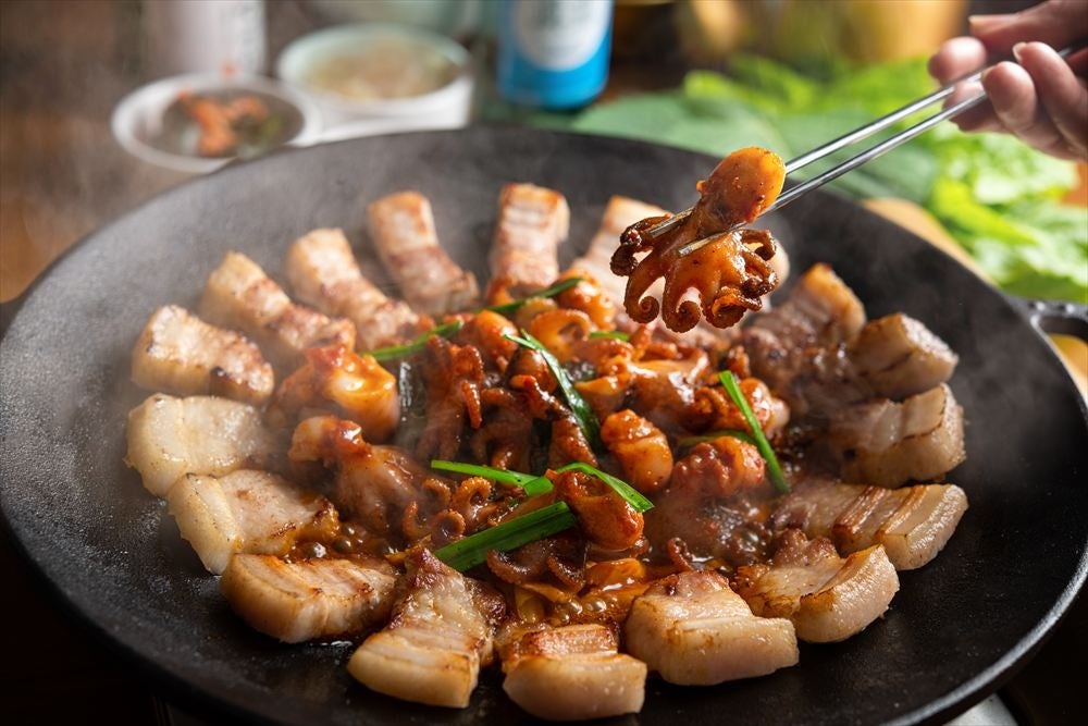 看板メニューは2種の「サムギョプサル」。王道の骨付き豚バラ肉のサムギョプサルをはじめ、やみつき必至の味わいと食感で人気の「チュクミ(イイダコ)サムギョプサル」をご用意しています。