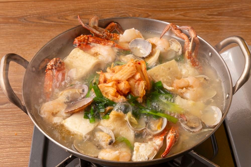 魚介の旨みが広がる日本の寄せ鍋に、韓国の定番キムチチゲの風味を重ねて“和×韓”にアレンジ。ワタリガニやアサリの出汁に、発酵キムチの酸味と辛味が溶け込み、コク深い味わいに仕上げました。