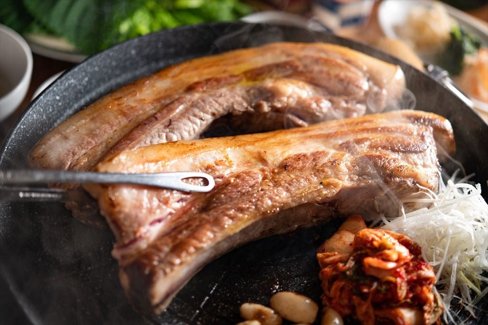 焼きキムチとシャキシャキ野菜で包めば、肉の甘みとキムチの酸味が絶妙に調和。熱々の鉄板から立ち上る香ばしい香りとともに、自慢のサムギョプサルをどうぞ。