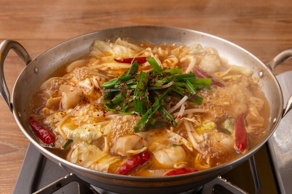 博多名物のもつ鍋をベースに、韓国風のピリ辛テイストに仕上げたラッキーソウル流もつ鍋。