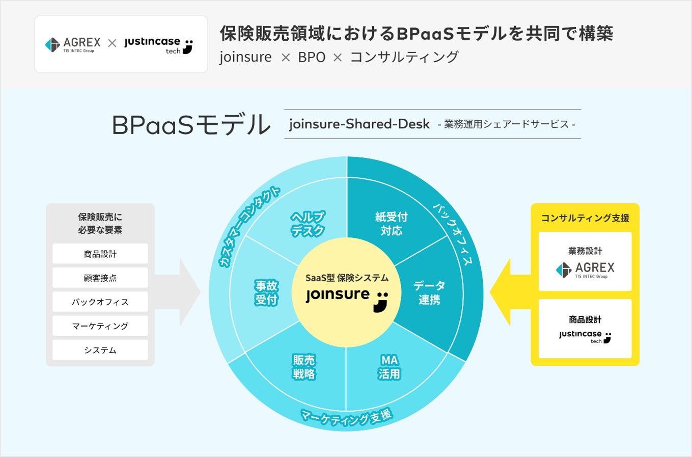 TISインテックグループの株式会社アグレックス(代表取締役社長:山本 修司、以下、アグレックス)と、保険DXを推進する株式会社justInCaseTechnologies(代表取締役:畑 加寿也、以下、justInCaseTechnologies)は、BPaaS※1領域における協業に向けた資本業務提携契約を締結したことを発表します。協業ビジネスの第一弾として、保険の商品設計から業務運用まで支援するBPaaSモデルの構築を開始しました。