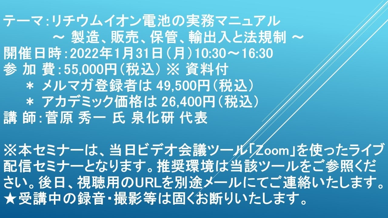先端技術情報や市場情報を提供している(株)シーエムシー・リサーチ(千代田区神田錦町: https://cmcre.com/ )では、 各種材料・化学品などの市場動向・技術動向のセミナーや書籍発行を行っておりますが、 このたび「リチウムイオン電池の実務マニュアル ~ 製造、販売、保管、輸出入と法規制 ~」と題するセミナーを、 講師に菅原 秀一 氏 泉化研 代表)をお迎えし、2022年1月31日(月)10:30より、 ZOOMを利用したライブ配信で開催いたします。 受講料は、 一般:55,000円(税込)、 弊社メルマガ会員:49,500円(税込)、 アカデミック価格は26,400円(税込)となっております(資料付)。