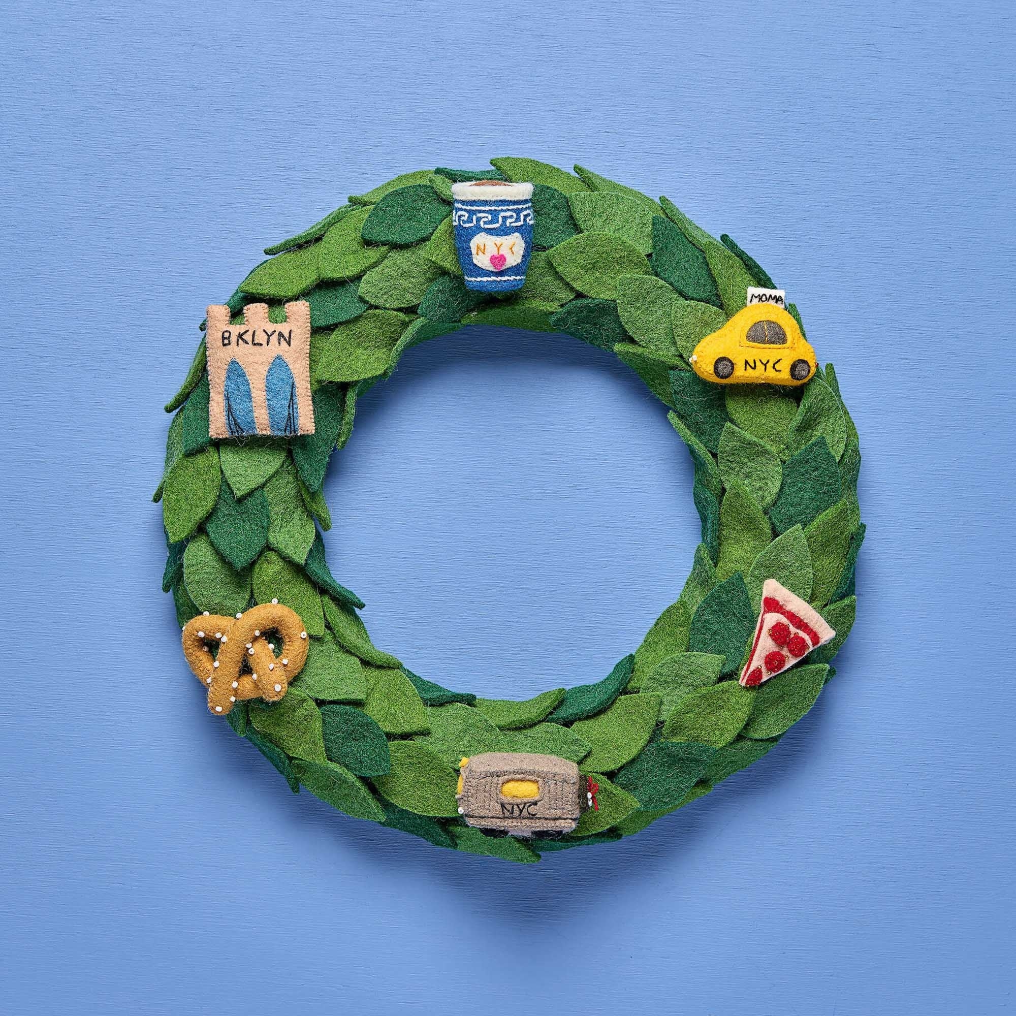 ニューヨークをテーマにしたフェルトリース。プレッツェル、ギリシャ系ダイナーのコーヒーカップ、プレイビル(演劇パンフレット)、地下鉄の車両、ブルックリン橋、1切れのピザ、MoMAのロゴが描かれたタクシーといったニューヨークで人気の6つのアイテムを、フェルトで作ったミニマスコットとしてあしらっています。