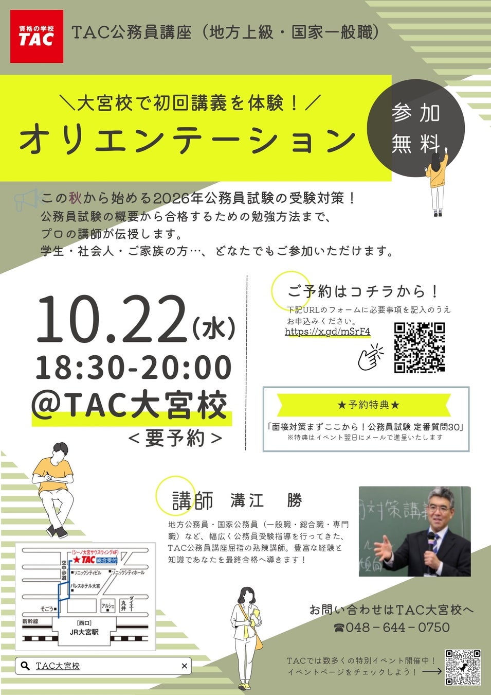【TAC公務員】「初回講義を体験!2026合格目標 公務員試験!オリエンテーション」を10/22(水)にTAC大宮校で開催!<参加無料・要予約>