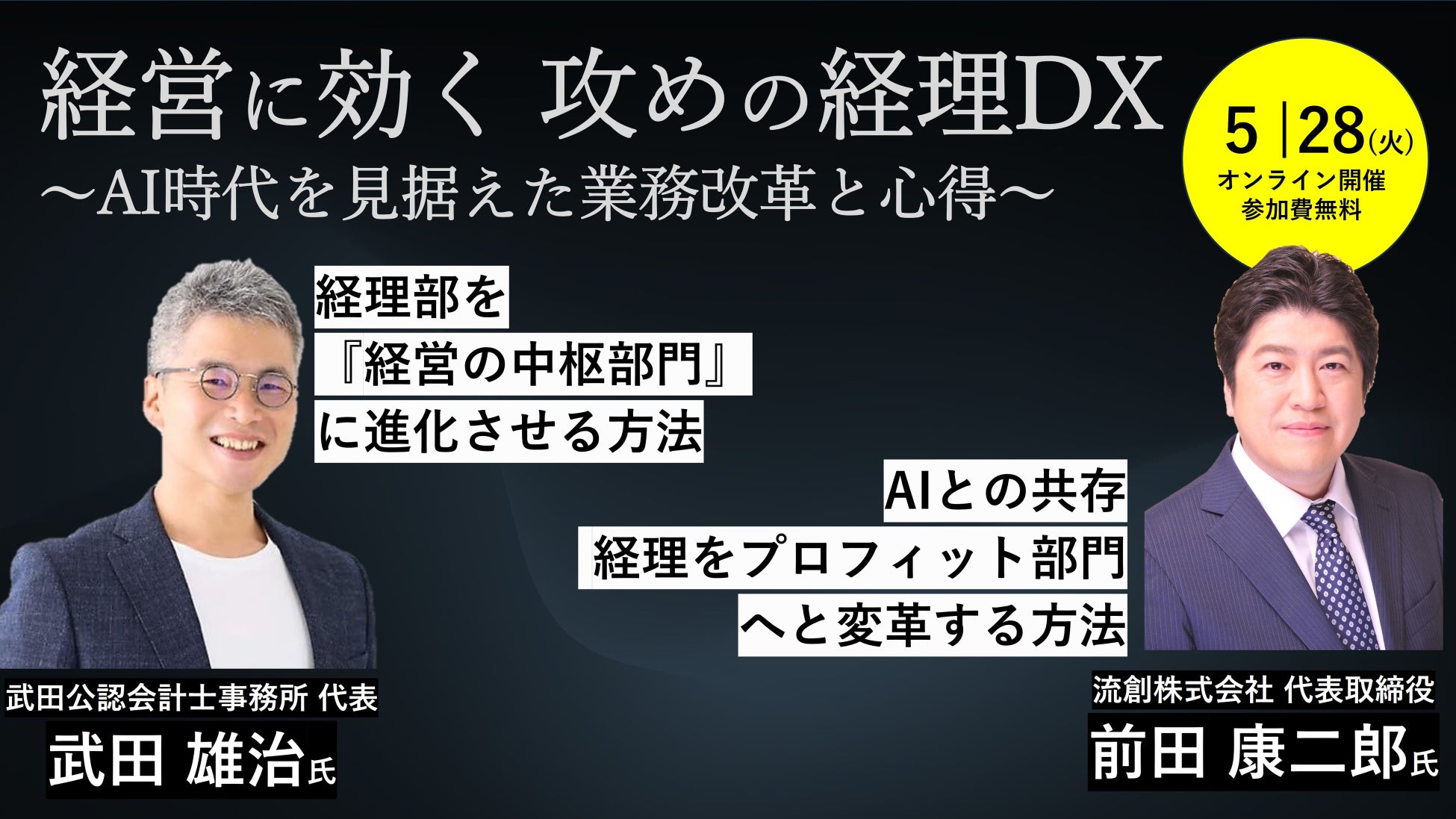 特別講演では、戦略経理を提唱する「流創」の代表取締役・前田康二郎氏が「経理とAIの共存」や経理をコスト部門からプロフィット部門へ変革する方法について解説します。