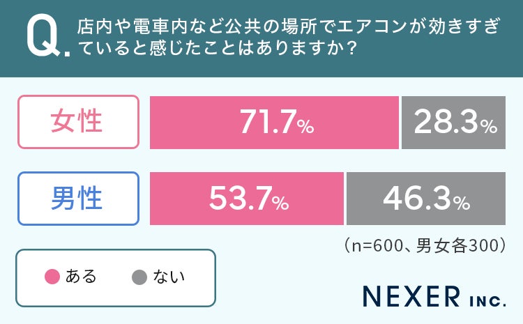 女性の7割以上、男性の5割以上が、店内や電車内など公共の場所でエアコンが効きすぎていると感じたことが「ある」と回答しています。
