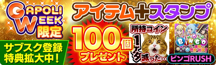 GAPOLI WEEKを記念してサブスク特典を拡大中!期間中に新規サブスク登録を行ったお客様を対象にアイテム+スタンプを合計100個プレゼントします!