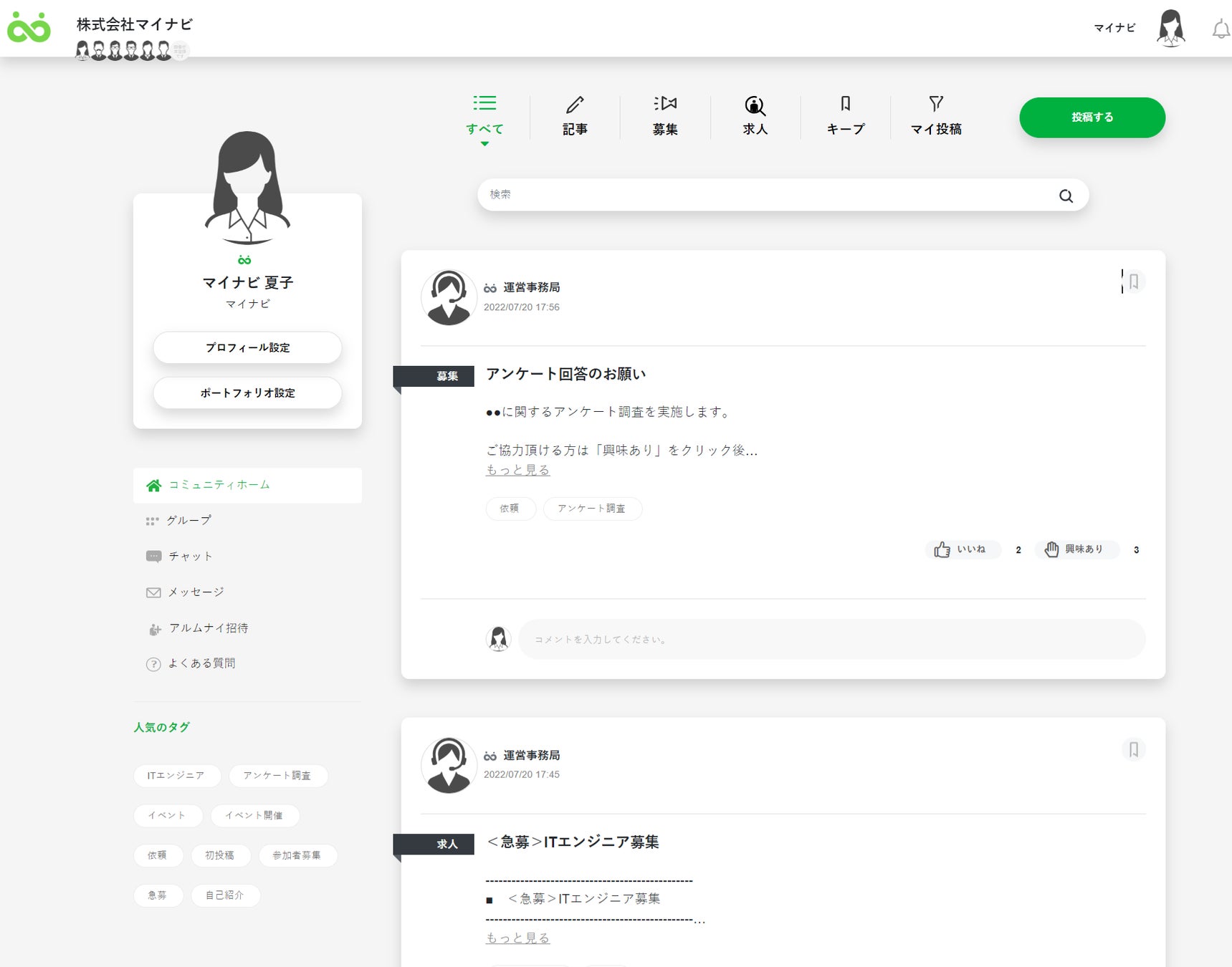 「記事」と「募集」の2種類から選択して投稿ができます。「記事」は近況の報告やさまざまな情報共有の手段として、「募集」は協働相手を探したりイベントの参加を促したりする際に活用します。