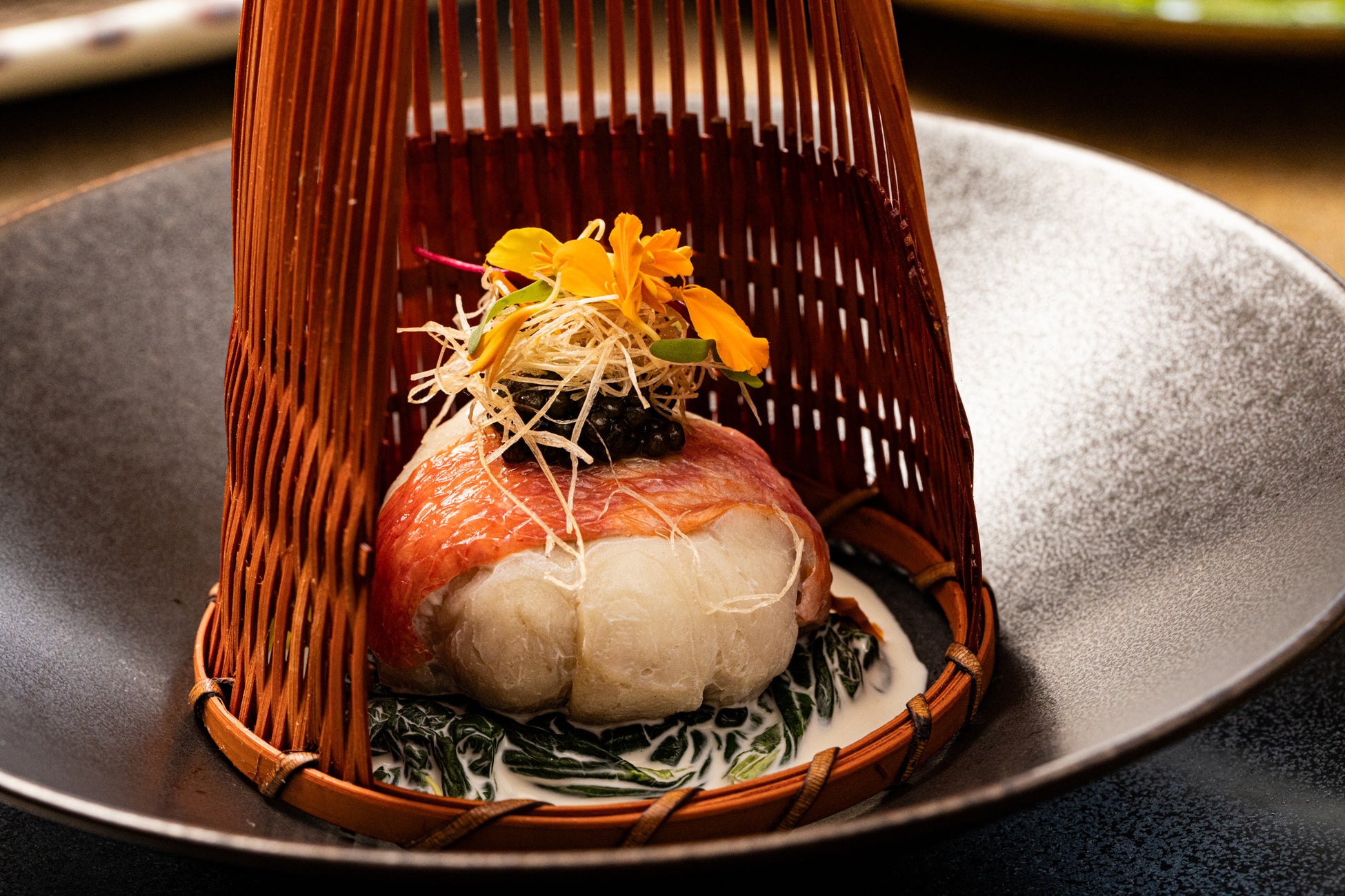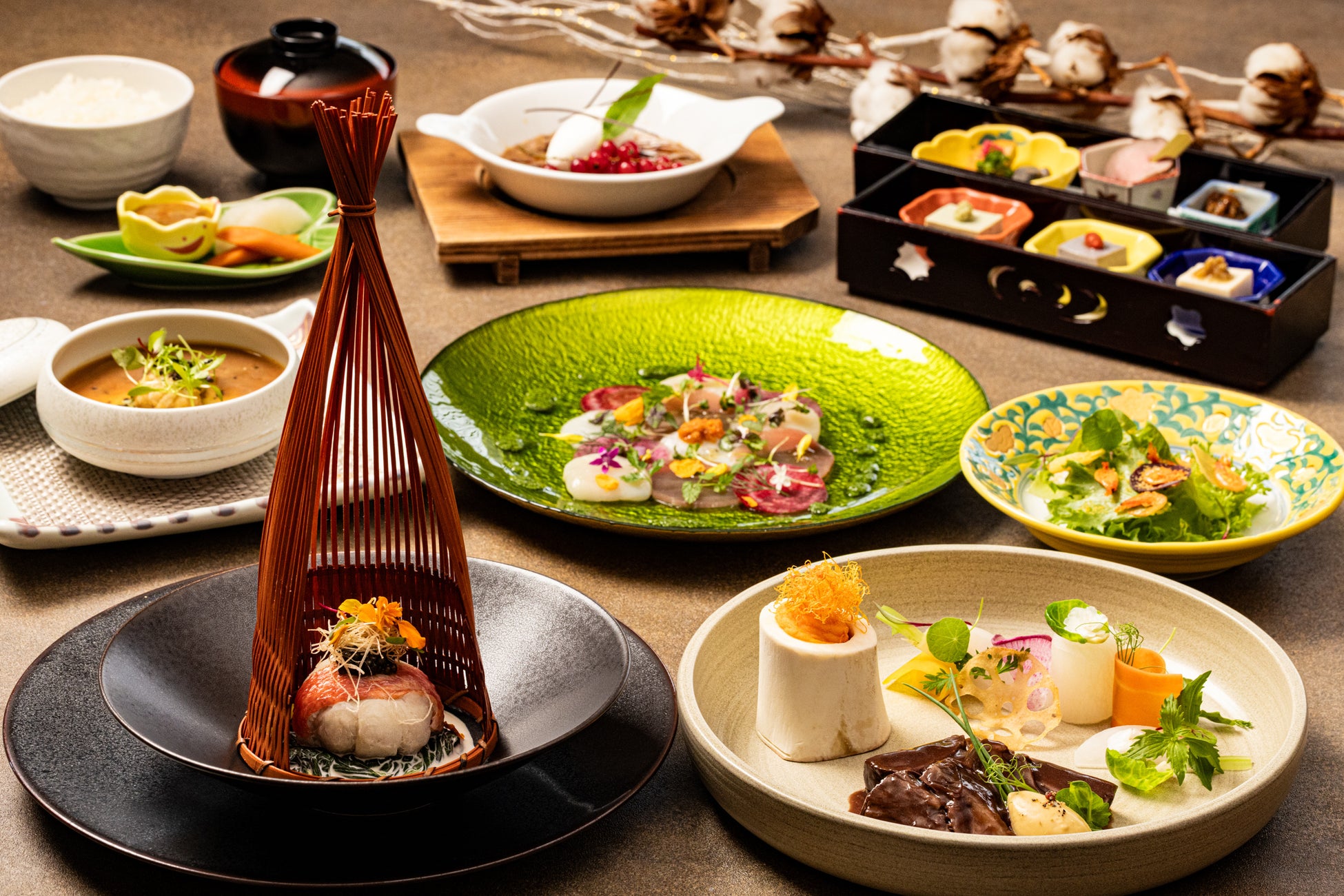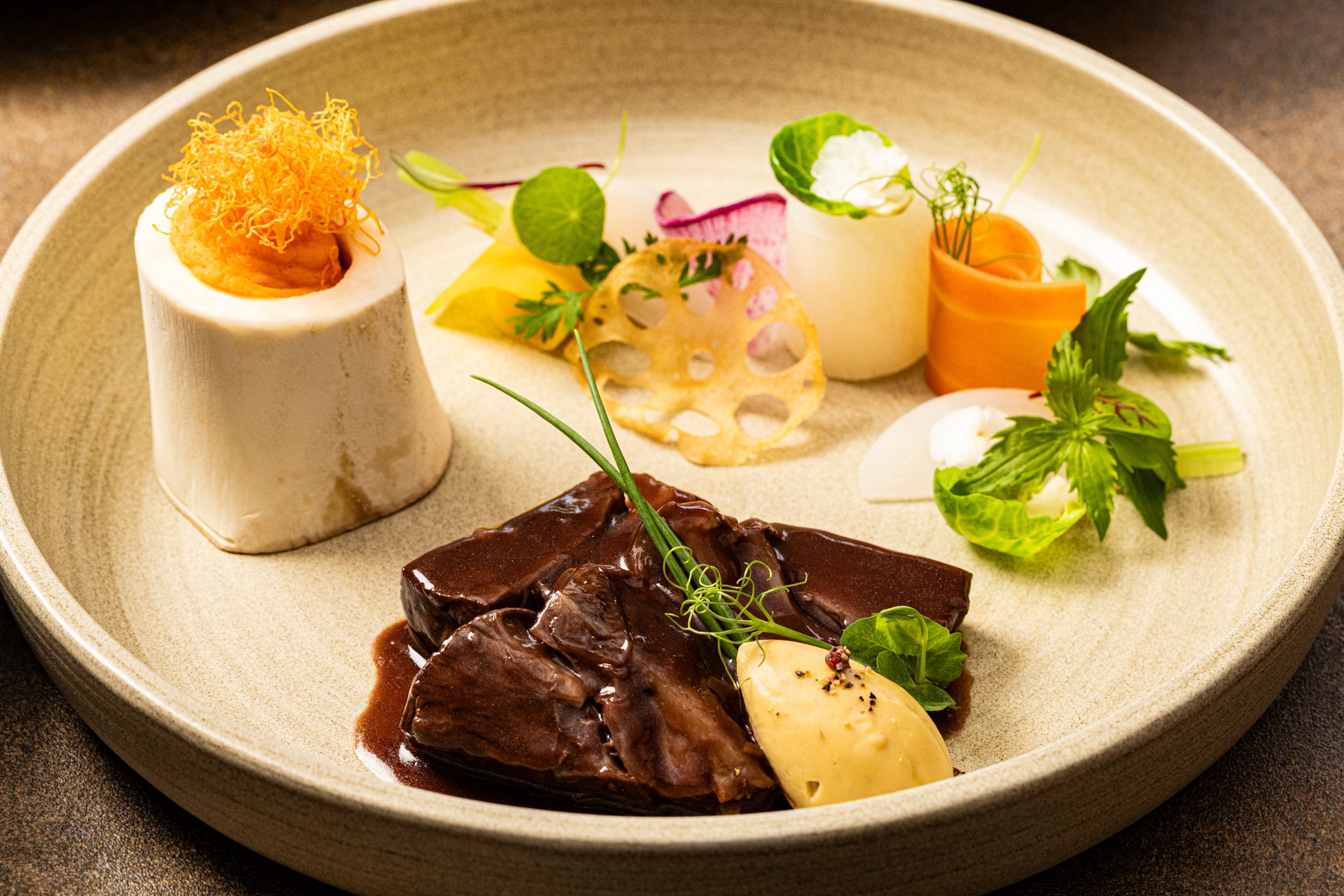 前菜には、地元産の3種の豆腐や鮟肝、鹿の燻製と軍鶏団子などを盛り合わせ、冬の訪れを感じさせる一品に。魚料理では、金目鯛のファルシーに地酒蔵・万代酒造の「あらばしり」を使用したスービーズソースとキャビアを添え、華やかな味わいと見た目にもこだわりました。肉料理には、フォアグラを忍ばせた黒毛和牛スネ肉のオーソボッコを、中伊豆ワインの芳醇なソースでご提供。さらに、冬トリュフの香りをまとわせた洋風茶碗蒸しや、からすみ・雲丹・このわたを用いた繊細な味の演出も楽しめるディナーコースです。