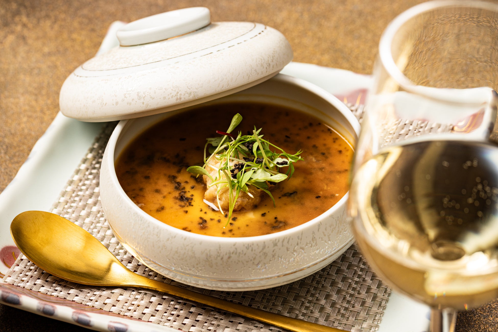 冬の伊豆は、海と山の恵みが一層深まる季節。今回のコースでは、伊豆産の豆腐や金目鯛、軍鶏などの地元食材に加え、キャビア・フォアグラ・トリュフの世界三大珍味、さらにこのわた・からすみ・雲丹といった日本三大珍味を随所に取り入れ、冬ならではの贅沢な味わいをお届けします。