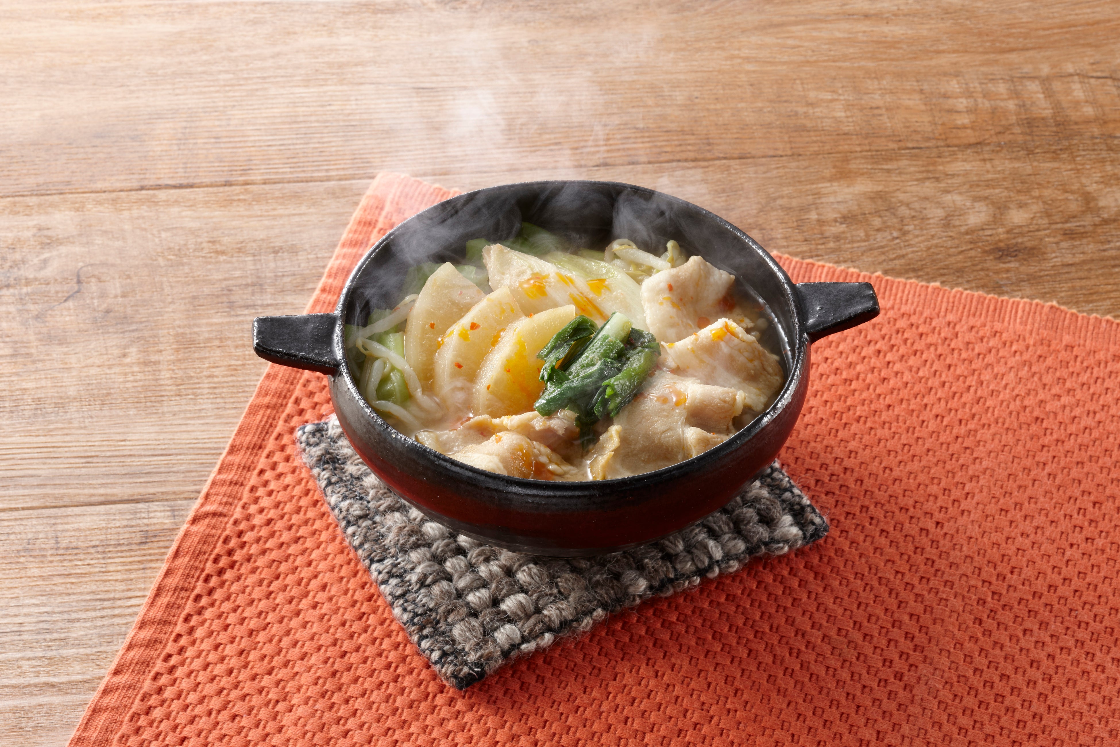 ワタミの外食店舗で長年親しまれている、香ばしいごまの風味とみそのコクがぎゅっと詰まった、濃密なスープを使ったひとり用チゲ鍋です。豚バラ肉と野菜の旨味がスープに染み渡り、ピリッと刺激的な辛さと、深いコクで食欲をぐっと引き立てます。