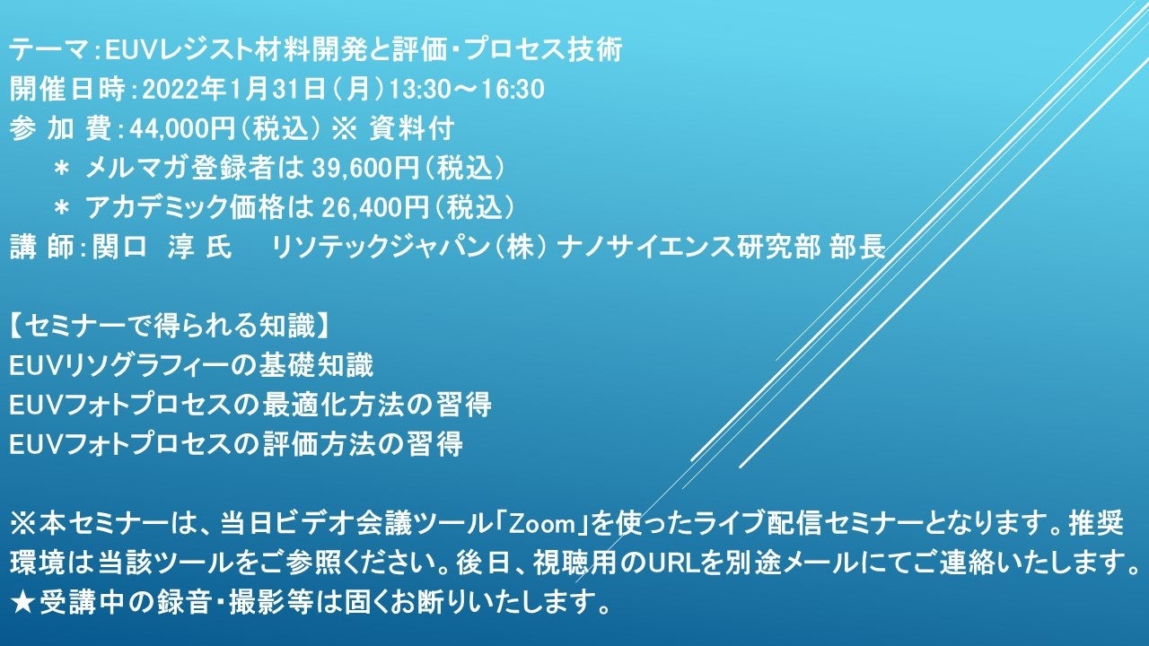 先端技術情報や市場情報を提供している(株)シーエムシー・リサーチ(千代田区神田錦町: https://cmcre.com/ )では、 各種材料・化学品などの市場動向・技術動向のセミナーや書籍発行を行っておりますが、 このたび「EUVレジスト材料開発と評価・プロセス技術」と題するセミナーを、 講師に関口 淳 氏 リソテックジャパン(株) ナノサイエンス研究部 部長)をお迎えし、2022年1月31日(月)13:30より、 ZOOMを利用したライブ配信で開催いたします。 受講料は、 一般:44,000円(税込)、 弊社メルマガ会員:39,600円(税込)、 アカデミック価格は26,400円(税込)となっております(資料付)。