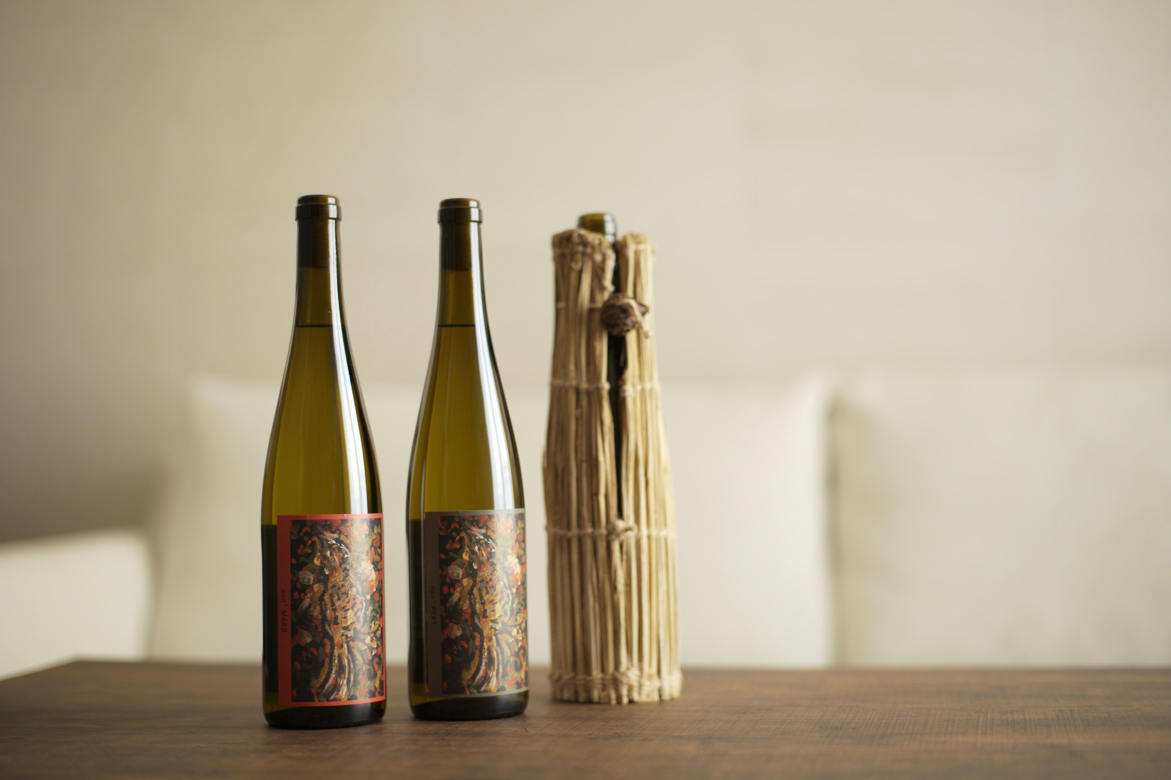 国内外から注目される佐々木要太郎の仕事のすべてを美しいビジュアルとともにまとめた初の著作が本書『遠野キュイジーヌ』だが、この本の発売を記念して佐々木要太郎が限定醸造したのが「とおの屋 要」の新酒、米糠を使った酒「マロ」(写真左)と「ピート」(写真中央。右側のワラのケースつき)だ。