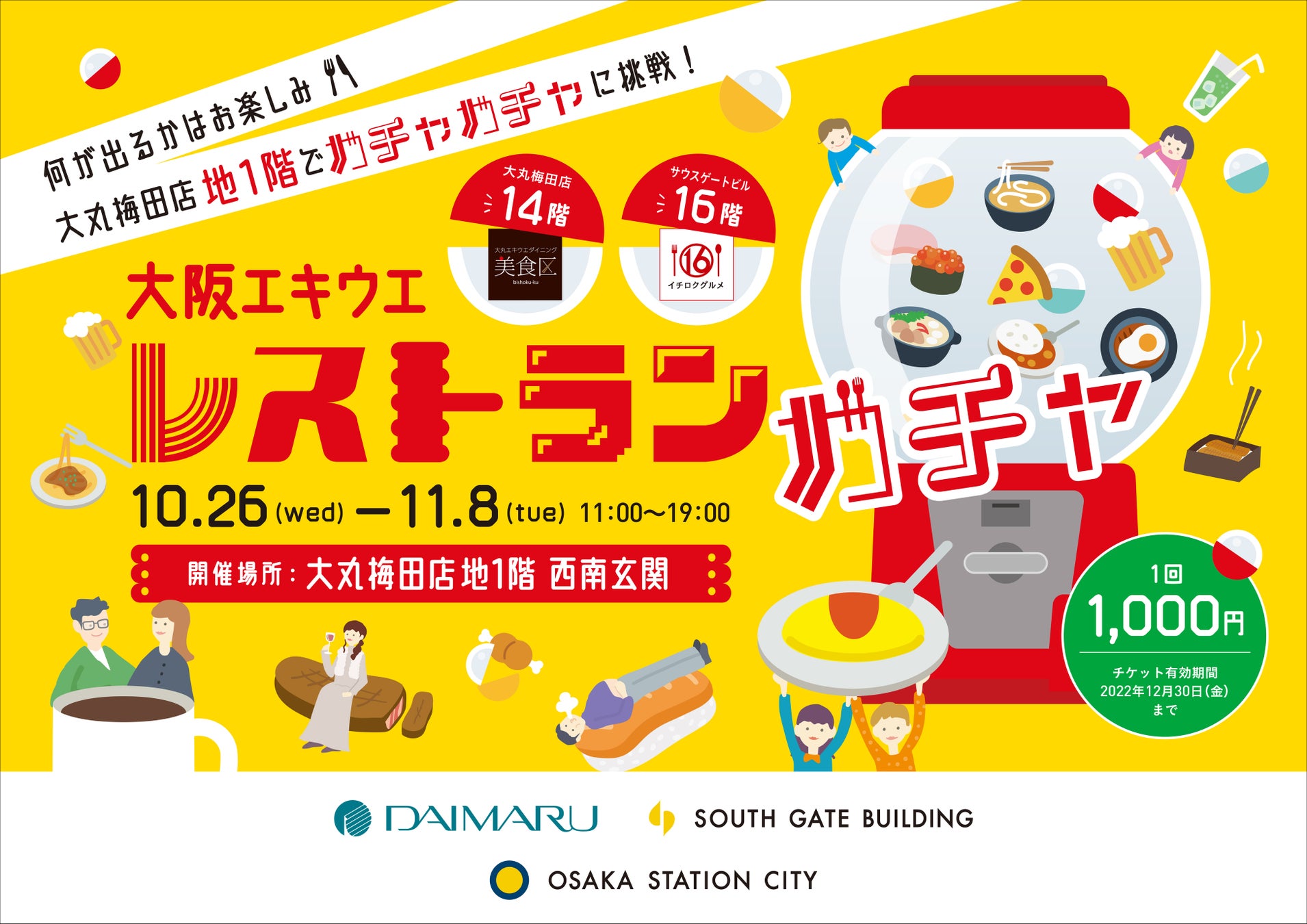 ここで、改めて、大阪駅の上(大阪エキウエ)にあるたくさんのレストランをご紹介し、便利に美味しく楽しく使っていただきたいという想いで、10/26(水)〜11/8(火)まで「大阪エキウエ レストランガチャ」を初開催します!