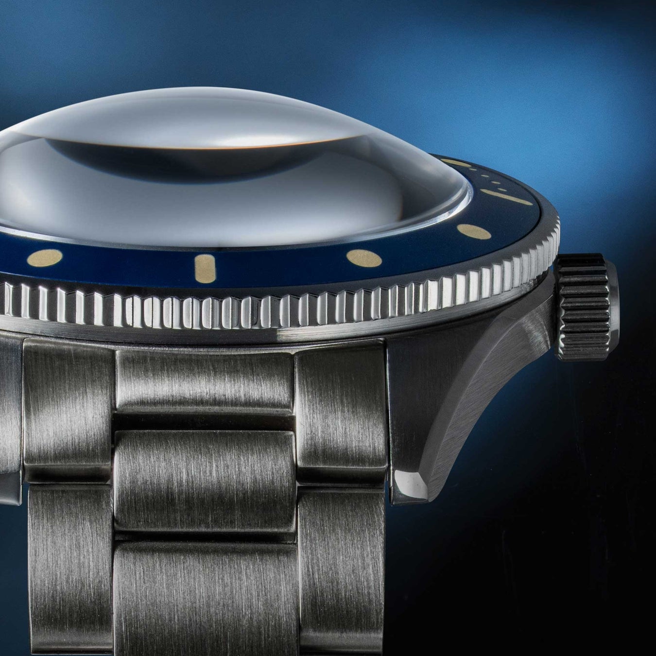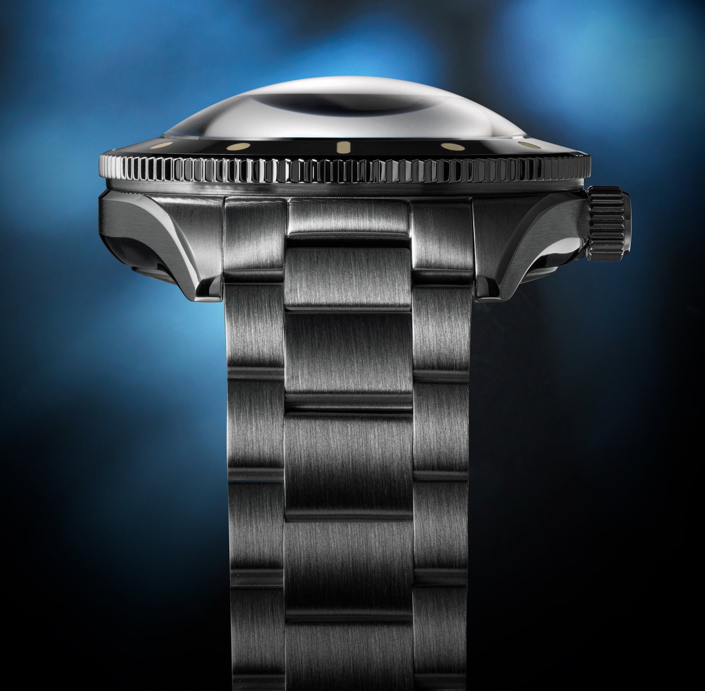 風防には、大きく突出したスーパードーム型サファイアレンズを採用。角度をつけて覗くと歪んで見えるさまは、水圧に耐えられるよう厚いガラスで構成された潜水艇の舷窓を彷彿とさせます。