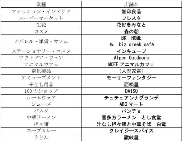 「アルパーク」には、中国地方・広島県初の専門店舗や飲食店が出店します。中国地方初の専門店として、アウトドアとライフスタイルを融合したセレクトショップ「Alpen Outdoors」が出店。コスメ、美容雑貨、ステーショナリーなどの専門店「インキューブ」や、アパレル・生活雑貨とカフェの「BK HOME&biz creek café」、動物たちとのふれあいやエサやり体験を楽しむことができるアニマルカフェ「MOFFアニマルカフェ」が広島県初出店します。