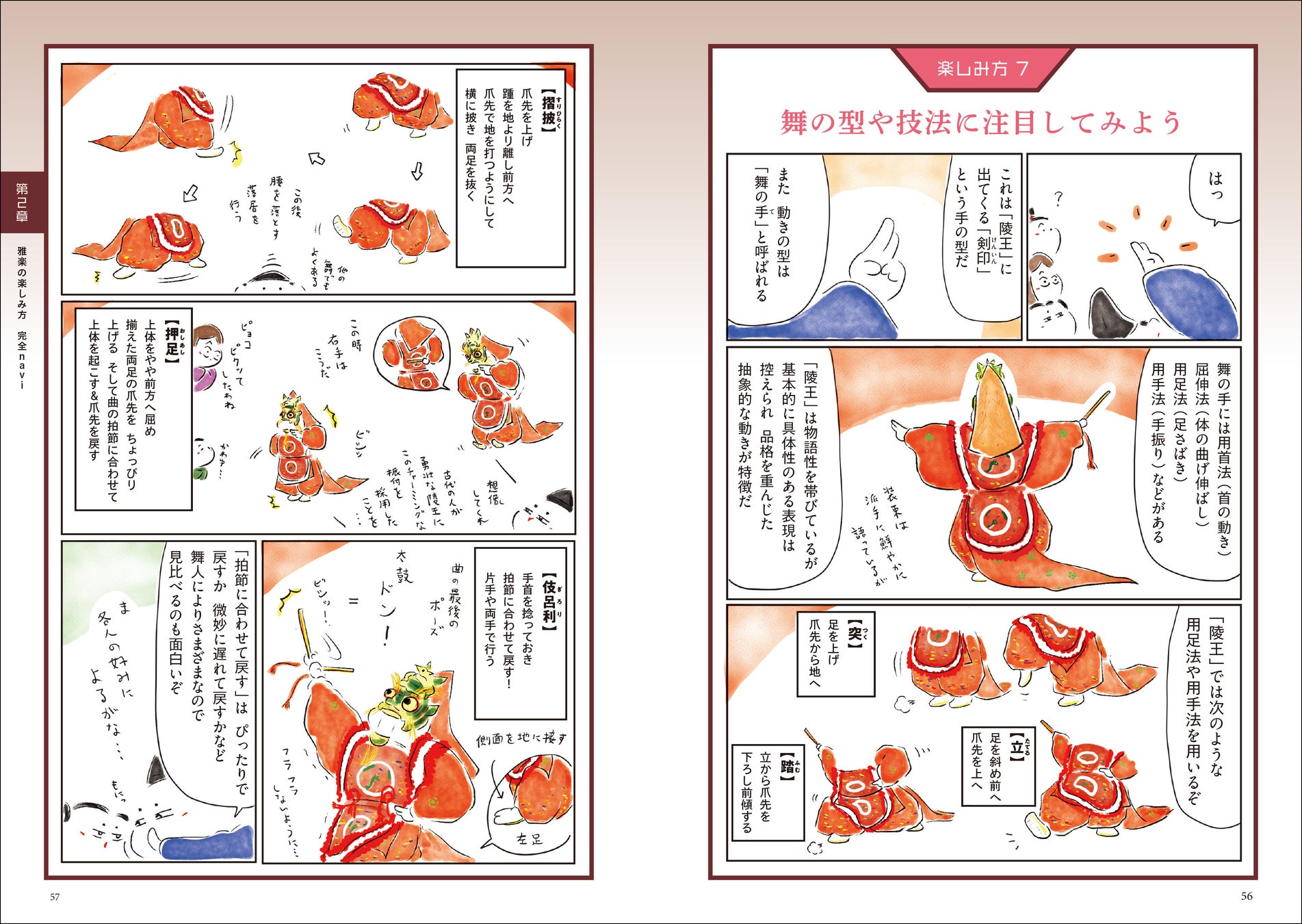 「全部同じ曲に聴こえてしまう」、「どこに注目すれば楽しめる?」とか「初心者におすすめの演目や鑑賞マナーがあれば教えて」という声に応えて、本書は雅楽初めてさんにもわかりやすいように、ポイントのあれこれをマンガで紹介しました。